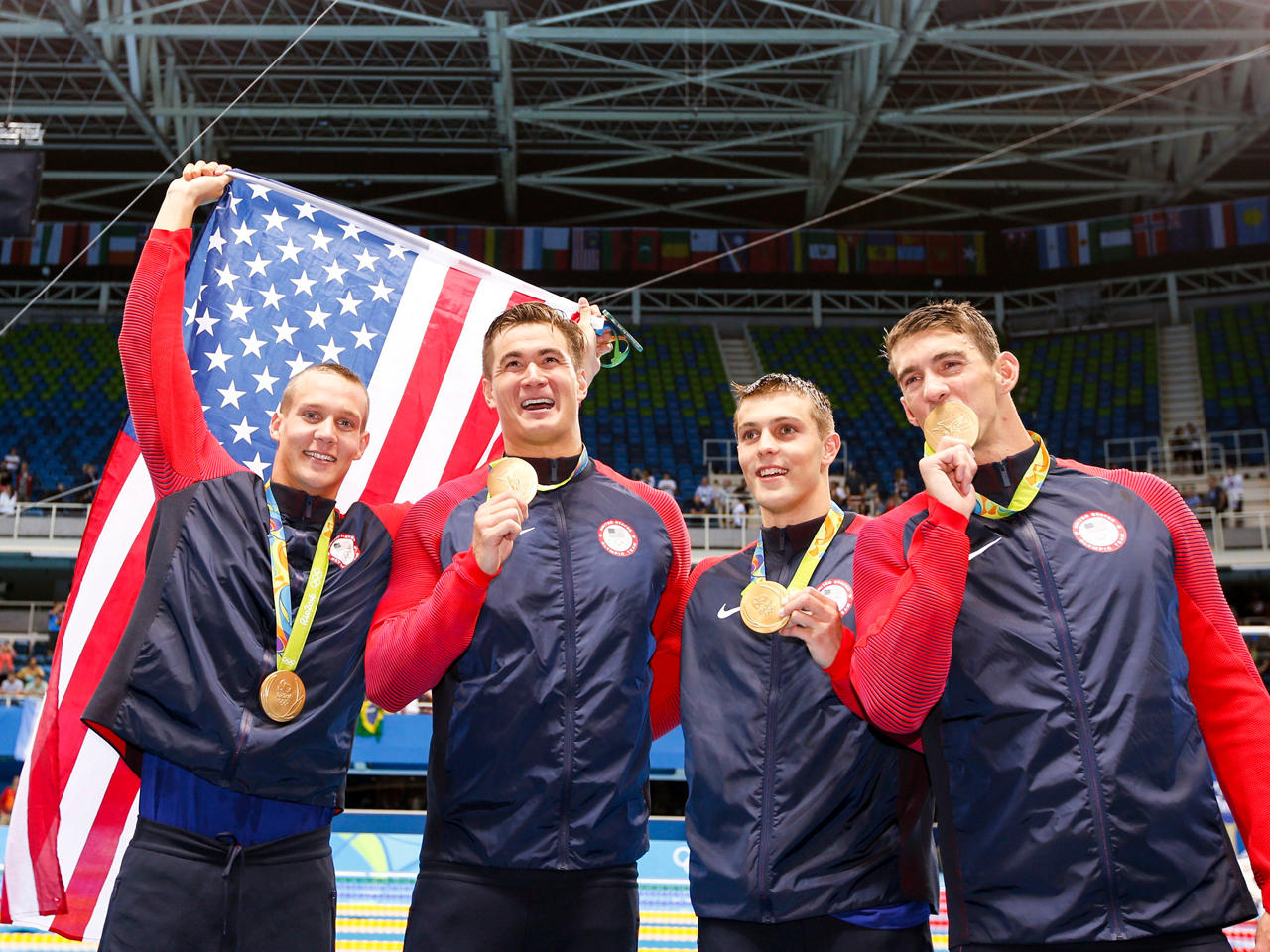 كان فيلبس ثاني المنطلقين في الفريق الأميركي، وطوق عنقه بالذهب مع كاليب دريسل وراين هيلد وناثان ادريان (3.09.92 دقائق) متقدمين على فرنسا، بطلة أولمبياد لندن 2012، ممثلة بمهدي ميتيلا وفابيان جيلو وفلوران مانودو وجيريمي سترافيوس (3.10.53 د) فيما نالت أستراليا مع جيمس روبرتس وكايل تشالمرز وجيمس ماغنوسون وكاميرون ماكيفوي البرونزية (3.11.37 د).ونال فيلبس في الدورات السابقة 6 ذهبيات في أثينا 2004 و8 ذهبيات في بكين 2008 و4 ذهبيات في لندن 2012، وفضيتين في لندن 2012 وبرونزيتين في أثينا 2004.يشارك فيلبس (31 عاماً) في أولمبياده الخامس في مسيرته وسيخوض أيضاً 3 سباقات فردية هي 100م و200م فراشة و200م متنوعة.تحطيم