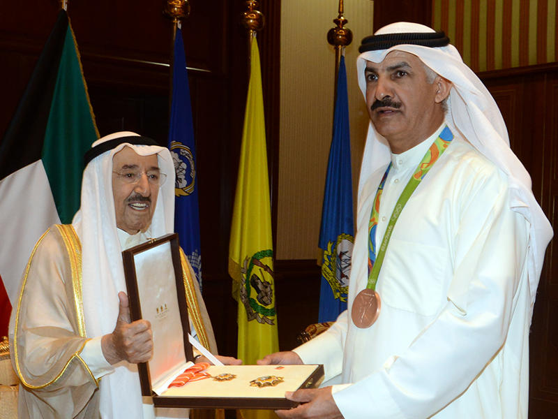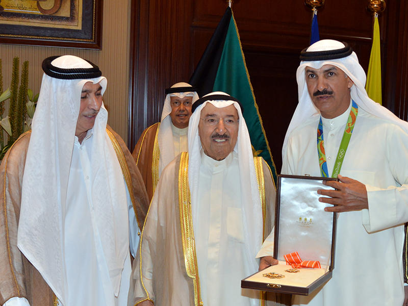 استقبل حضرة صاحب السمو أمير البلاد الشيخ صباح الأحمد الجابر الصباح حفظه الله ورعاه بقصر بيان صباح اليوم وبحضور سمو ولي العهد الشيخ نواف الأحمد الجابر الصباح استقبل سموه رعاه الله وزير الإعلام ووزير الدولة لشؤون الشباب الشيخ سلمان صباح سالم الحمود الصباح ورئيس مجلس الإدارة والمدير العام للهيئة العامة للرياضة الشيخ أحمد منصور الأحمد الصباح والرامي فهيد محمد الديحاني وذلك بمناسبة حصوله على الميدالية الذهبية في مسابقة الحفرة المزدوجة والرامي عبدالله الطرقي الرشيدي وذلك بمناسبة حصوله على الميدالية البرونزية في منافسات رماية السكيت للرجال ومجموعة من الرياضيين المشاركين بدورة الألعاب الأولمبية الصيفية والمقامة في مدينة ريو دي جانيرو بجمهورية البرازيل الاتحادية الصديقة.وقد أشاد سموه رعاه الله بالإنجاز الرياضي الكبير والمتميز الذي حققه الرامي فهيد محمد الديحاني لما له من مصدر فخر واعتزاز وإضافة للمسيرة الرياضية الكويتية والعربية الحافلة خاصة وأنها الميدالية الذهبية الأولى للعرب في هذه الدورة مشيراً سموه للروح المعنوية العالية التي تحلى بها والأداء المميز الذي أثبت قدرة شباب الكويت على تحدي الصعاب وتحقيق مثل هذه الإنجازات الرياضية المشرفة مما ساهم في رفع راية الكويت والعرب في المحافل الرياضية العالمية.