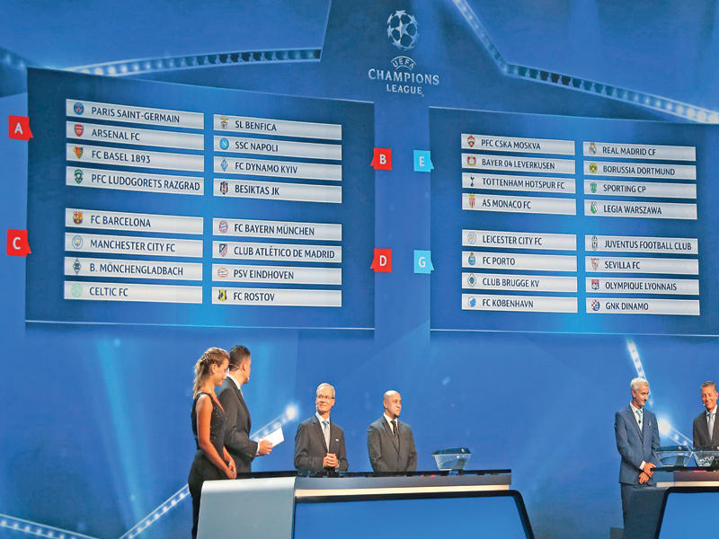 - المجموعة الأولى: باريس سان جرمان (فرنسا)، ارسنال (انكلترا)، بازل (سويسرا)، لودوغوريتس (بلغاريا).- المجموعة الثانية: بنفيكا (البرتغال)، نابولي (البرتغال)، دينامو كييف (أوكرانيا)، بشيكتاش (تركيا).- المجموعة الثالثة: برشلونة (اسبانيا)، مانشستر سيتي (انكلترا)، بوروسيا مونشنغلادباخ (المانيا)، سلتيك (اسكتلندا).- المجموعة الرابعة: بايرن ميونيخ (المانيا)، اتلتيكو مدريد (اسبانيا)، ايندهوفن (هولندا)، روستوف (روسيا).- المجموعة الخامسة: سسكا موسكو (روسيا)، باير ليفركوزن (المانيا)، توتنهام (انكلترا)، موناكو (فرنسا).- المجموعة السادسة: ريال مدريد (اسبانيا)، بوروسيا دورتموند (المانيا)، سبورتينغ لشبونة (البرتغال)، ليخيا وارسو (بولندا).- المجموعة السابعة: ليستر سيتي (إنكلترا)، بورتو (البرتغال)، كلوب بروج (بلجيكا)، كوبنهاغن (الدنمارك). - المجموعة الثامنة: يوفنتوس (إيطاليا)، اشبيلية (إسبانيا)، ليون (فرنسا)، دينامو زغرب (كرواتيا).تقام الجولة الأولى في 13 و14 سبتمبر المقبل، والجولة الاخيرة في 7 و8 ديسمبر. أما المباراة النهائية فتقام على ملعب ميلينيوم في مدينة كارديف عاصمة ويلز في 3 يونيو 2017.