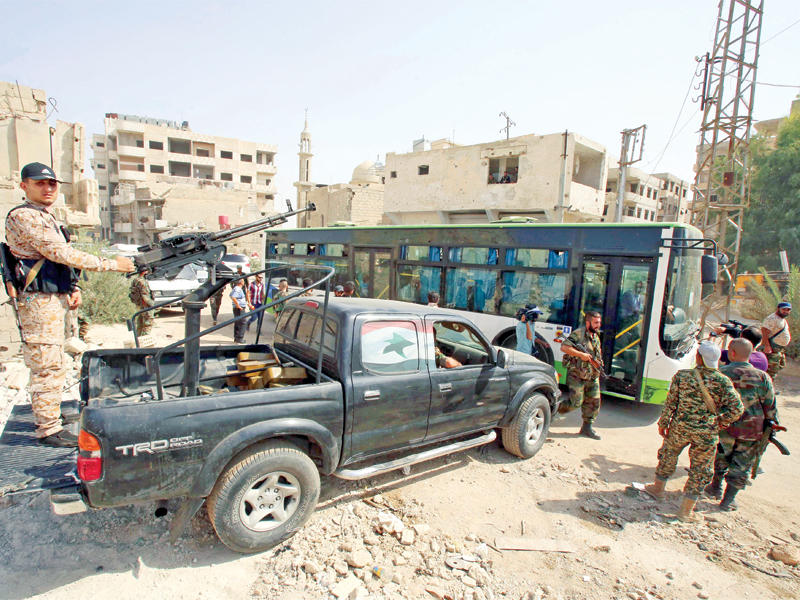 بعد أربعة أعوام من الحصار والتجويع، نجح الرئيس السوري بشار الأسد في إجبار أهالي داريا، الواقعة في الغوطة الغربية لدمشق، على رفع راية الاستسلام وترك مدينتهم رمز الثورة ضد نظامه لتدخلها قواته غير منتصرة وتستولي على ما تبقى من أنقاضها، في إطار اتفاق مع فصائل المعارضة يقضي بخروج 700 مقاتل إلى إدلب وتسليم أسلحتهم و4000 من الرجال والنساء مع عائلاتهم إلى مراكز إيواء.ووسط أجواء حزن عارمة، بدأ تنفيذ الاتفاق، الذي يشكل ضربة شديدة للمعارضة وجائزة طال انتظار الأسد لها، بإجلاء النساء والأطفال والمسنين في حافلات رافقتها سيارات عسكرية وأخرى تابعة للهلال الأحمر السوري، بحسب ناشطين محليين وعضو في فريق التفاوض الحكومي، باتجاه العاصمة دمشق وتحديداً إلى منطقة عدرا حيث سيقيمون هناك في مراكز إيواء. ووفق مصادر عسكرية في داريا، فإن الدفعة الأولى تضمنت أيضاً خروج «300 مقاتل مع عائلاتهم» على أن تستكمل باقي العملية اليوم، موضحاً أن «الذي لا يريد المصالحة سيذهب باتجاه مدينة إدلب (الواقعة تحت سيطرة فصائل جيش الفتح)، والذي يريد البقاء سيذهب الى منطقة حرجلة» في الغوطة الغربية الواقعة تحت سيطرة قوات النظام. وأكد مجلس داريا المحلي أن «المدنيين سيتوجهون إلى بلدة حرجلة، ومن هناك يتوزعون على المناطق التي يرغبون في التوجه إليها».يذكر أن لداريا رمزية خاصة لدى المعارضة، فهي كانت في طليعة حركة الاحتجاج ضد الأسد في مارس 2011، كما أنها خارجة عن سلطته منذ أربع سنوات بعدما تحولت الاحتجاجات إلى نزاع مسلح، وهي من أولى البلدات التي فرض عليها الحصار.
