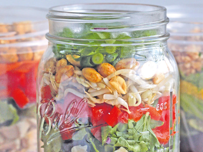 • اخلطي الخل مع زيت الزيتون وزيت السمسم إلى أن تصبح تركيبة الخليط مثل المستحلب. ثم أضيفي زبدة الفستق والعسل وصلصة التماري والسريراتشا إذا كنت تستعملينها، وحرّكي الخليط إلى أن يصبح ناعماً. تذوّقيه وعدّليه عند الحاجة.• اسكبي الصلصة في أسفل 4 أوعية طويلة. اخلطي الملفوف مع الكزبرة ثم قسّمي هذا الخليط على كل وعاء. أضيفي طبقات من الدجاج والخس والفلفل الأحمر وبراعم الفاصوليا والجزر والبصل الأخضر والفستق وبذور السمسم. ضعي السلطة في البراد حتى موعد تقديمها.في الحصة الواحدة: 602 سعرة حرارية، 45 غراماً من الدهون، 7 غرامات من الدهون المشبعة، 37 ملغ من الكولسترول، 29 غراماً من البروتينات، 28 غراماً من الكربوهيدرات، 14 غراماً من السكر، 7 غرامات من الألياف، 1113 ملغ من الصوديوم، 122 ملغ من الكالسيوم.سلطة بقمح الفارو وجبنة الفيتا والحمص المشوي