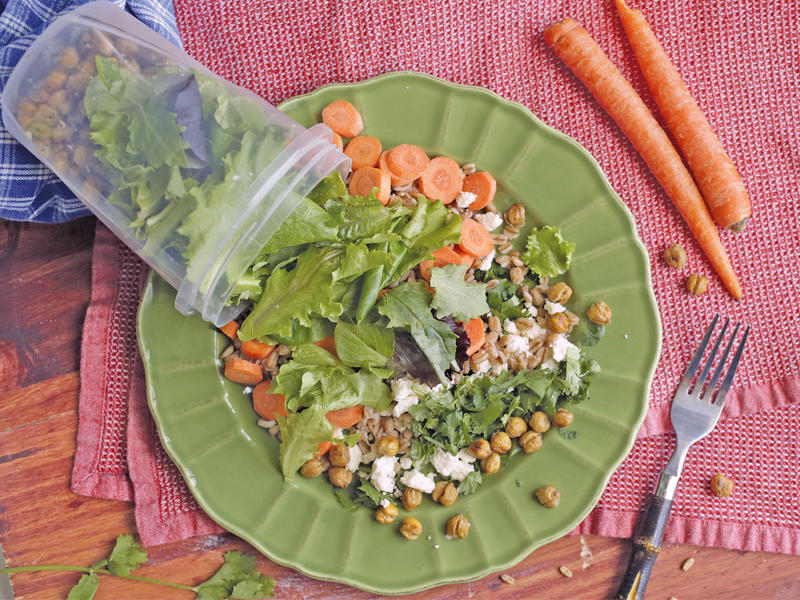 • علبة حمص (430 غراماً).• ملعقة كبيرة من زيت الزيتون.• ¾ ملعقة صغيرة من الملح.• ثِمن ملعقة صغيرة من الفلفل.• كوب من قمح الفارو أو الأرز الأسمر.• ملعقتان كبيرتان من صلصة السمك.• 3 ملاعق كبيرة من عصير الليمون.• 3 ملاعق كبيرة من السكر الأسمر.• 6 ملاعق كبيرة (85 غراماً) من الماء.• فص ثوم متوسط ومقطّع إلى شرائح رفيعة.• حبة من الفلفل الحار التايلندي المقطّع إلى شرائح رفيعة جداً (أو فلفل سيرانو).• 170 غراماً من جبنة الفيتا.• 4 حبات جزر مقشرة ومقطعة إلى شرائح.• ملعقتان كبيرتان من الكزبرة المفرومة.الطريقة: