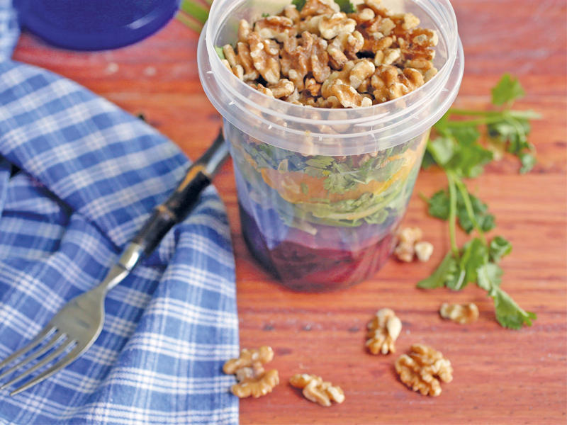قد يكون هذا المنطق وراء نزعة جديدة ولذيذة لتحضير السلطات في أوعية شفّافة. الطبق عبارة عن سلطة متعددة الطبقات لكنها تتألف من قطعة واحدة.