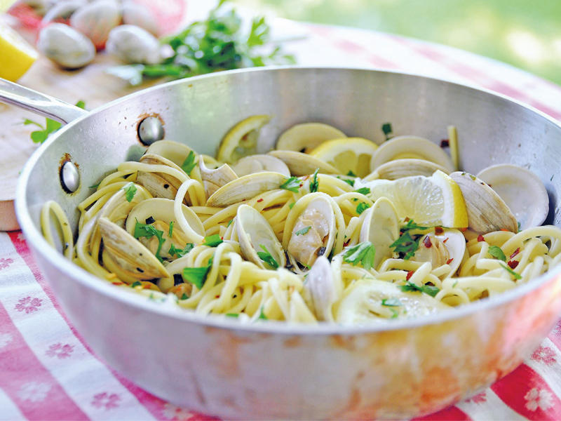 • بين 220 و340 غراماً من معكرونة لينغويني.• ملعقتان كبيرتان من زيت الزيتون، وكمية إضافية لتحسين النكهة.• ملعقتان كبيرتان من الزبدة.• فصا ثوم مفرومان.• رشة من الفلفل الأحمر المسحوق.• ملح وفلفل أسود مطحون.• ملعقة صغيرة من ورق الزعتر الطازج.• ملعقة صغيرة من الأوريجانو الطازج المفروم.• نصف كوب من عصير أو مرق المحار.• حوالى 24 حبة محار (كمية إضافية إذا كانت الحبات صغيرة).• شريحتا ليمون.• ملعقة صغيرة من البقدونس الطازج المفروم.الطريقة:
