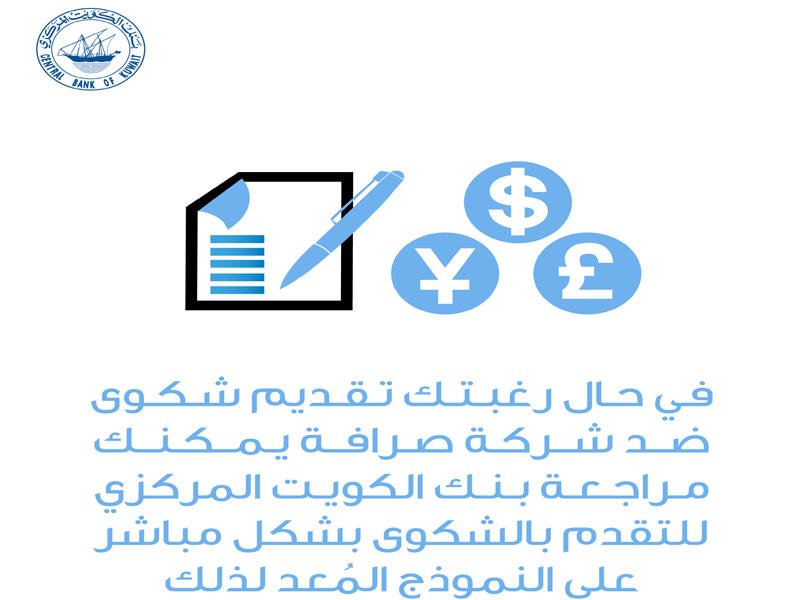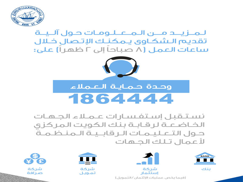 أصدر بنك الكويت المركزي إعلاناً توعوياً يبين فيه طرق وتسلسل إجراءات تقديم الشكاوى الواجب إتباعها من قبل العملاء في حال تقديمها لدى الجهات الخاضعة لرقابته وقبل أن يتم تقديمها له.وقال «المركزي» في بيان صحافي اليوم السبت إن الإعلان يأتي في إطار الجهود التي يوليها البنك لحماية حقوق عملاء الجهات الخاضعة لرقابته ومنها الضمانات المتوفرة لهم بتقديم شكاوى أو تظلمات حول ما يتعلق بمعاملاتهم التي يجرونها أو الخدمات التي يحصلون عليها.
