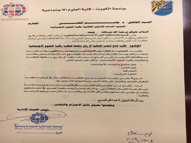 طالبت جمعية كلية العلوم الاجتماعية في جامعة الكويت، العميد المساعد للشؤون الطلابية بالكلية د. جاسم العلي بفتح شعب إضافية أو رفع سقفها للطلبة في اقسام علم الاجتماع والخدمة الاجتماعية، وعلم النفس، والجغرافيا، والعلوم السياسية.وأشارت الجمعية، خلال كتاب رسمي موجه لعمادة الكلية، الى ان المطالبة بزيادة الشعب جاءت بناء على الرغبة والإقبال الشديد من المجاميع الدراسية التي تحتاج إلى التسجيل بها، آملة موافقة ادارة الكلية على ذلك بما يتناسب مع مصلحة الجموع والمسيرة الدراسية في الكلية.