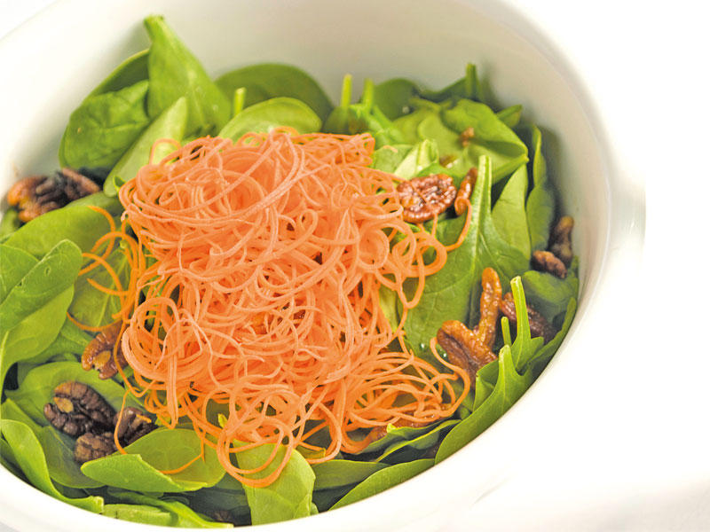في وعاء، وزعي طبقة من أوراق السلطة. ثم أضيفي الكرز الأسود ومكعبات من جبنة الغنم ورقائق الجوز. تبّلي الخليط بكمية من زيت الجوز والخل والملح والبهار.استبدلي الجبنة بالتوفو كي تصبح الوجبة نباتية بالكامل وخالية من اللاكتوز. يمكنك استعمال زيت الزيتون بدل زيت الجوز.خلطة لحماية القلب: جوز ودجاج