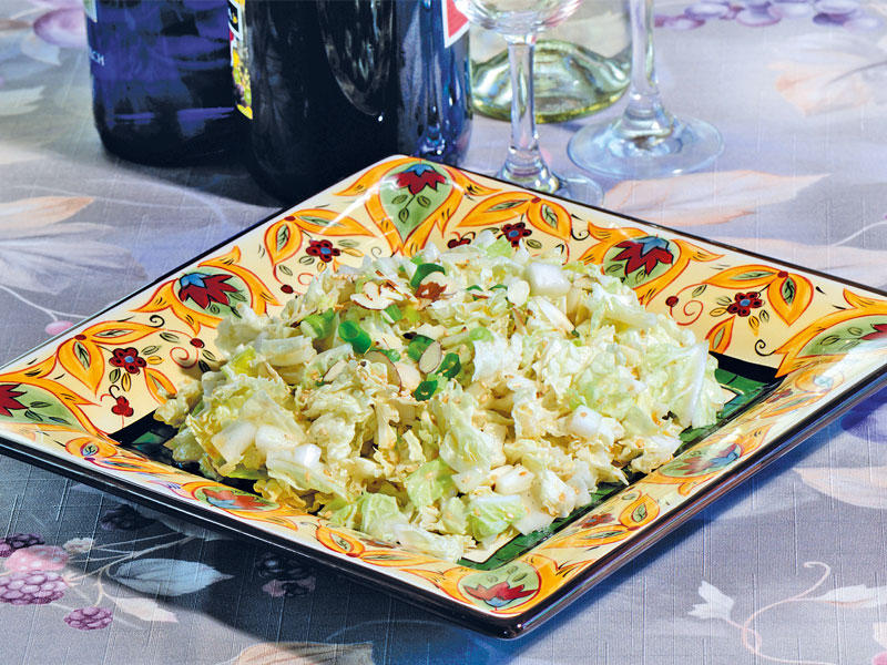قطعي الملفوف إلى براعم واخلطيها مع جبنة بيضاء ورقائق الجوز وتمر منزوع البذور والمقطّع إلى مكعبات وملح وبهار. يجب أن تكون كمية الجوز أكبر من التمر بمرتين أو ثلاث مرات. انقعي البراعم في الصلصة وتذوقيها.يمكنك استبدال الجبنة بكريما الصويا. أضيفي أصابع الجزر والكرفس والفجل...