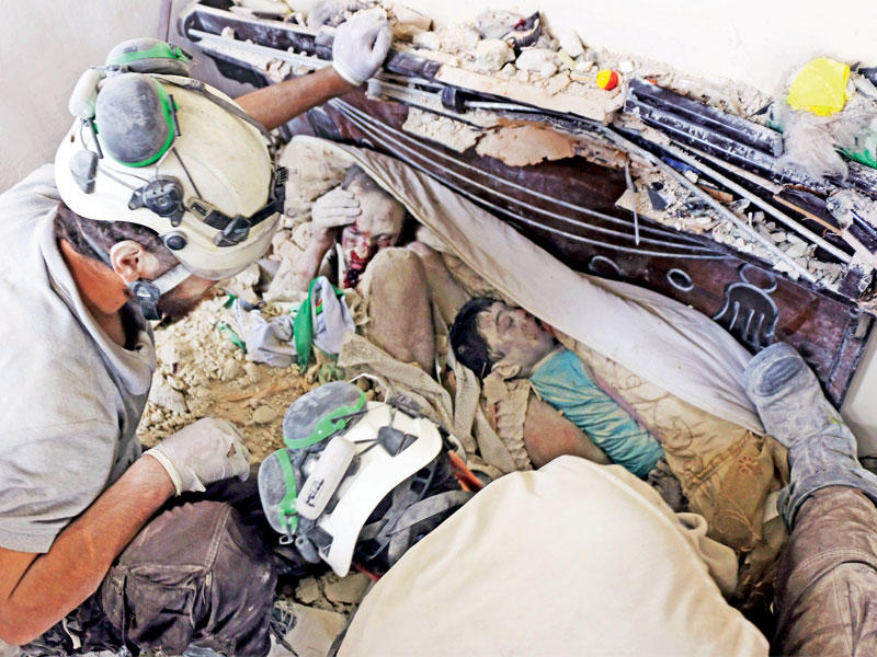 واصل نظام الرئيس السوري بشار الأسد، مدعوماً بالجيش الروسي، غاراته الوحشية على شرق حلب، أمس، في إطار الهجوم الواسع الذي أعلنه الخميس الماضي، في محاولة، على ما يبدو، لدفع المدنيين إلى مغادرة المنطقة الخاضعة لسيطرة المعارضة، وتدميرها تماماً. وبحسب تقارير أولية، فقد قتل، أمس، أكثر من 100 شخص في غارات على «حلب الشرقية». وقال مدير المرصد السوري لحقوق الإنسان رامي عبدالرحمن، إن «النظام يقصف بشدة هذه المنطقة، لأنه يريد إرغام سكانها على المغادرة، واستعادة السيطرة عليها».وأوضح مراسل لوكالة «فرانس برس» في الأحياء الشرقية من حلب أن حجم الدمار كبير، خصوصاً في أحياء الكلاسة وبستان القصر التي اختفى عدد من شوارعها تقريباً بسبب انهيار الأبنية.