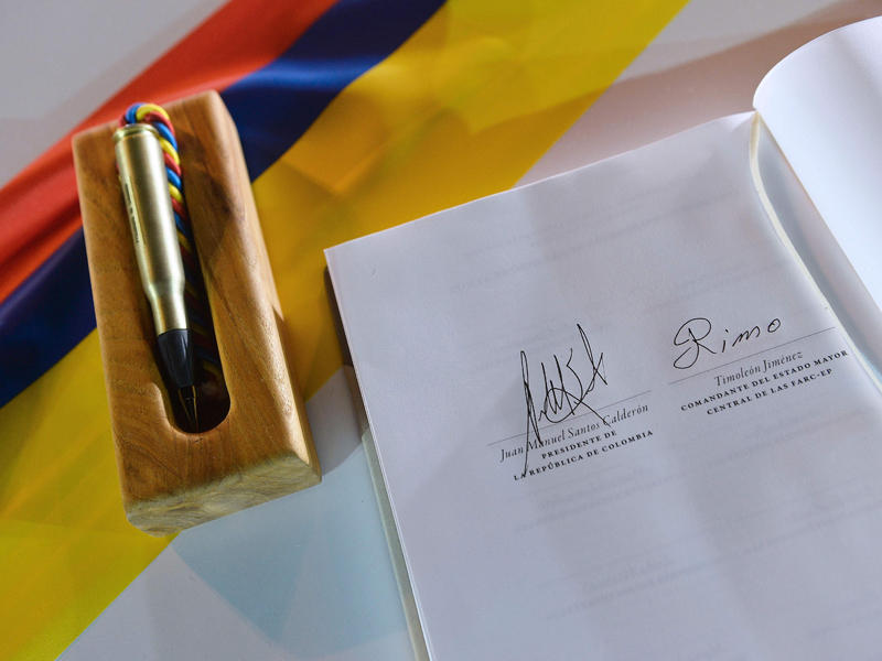 وبعد ذلك حلق سرب من الطائرات فوق كارتاهينا، وقال زعيم التمرد مازحاً أمام سانتوس الذي بدا مبتسماً أن هذه الطائرات جاءت «تحيي السلام وليس لتلقي قنابل».قال رئيس الدولة «لا حرب بعد الآن! لا حرب بعد الآن!»، قبل أن يكرر الحشد وراءه هذه العبارة، وأضاف «لا مزيد من القتلى بعد الآن لحرب عبثية»، مشيداً بقرار حركة التمرد «استبدال الرصاص بالتصويت» عبر هذا الاتفاق الذي يسمح لهم بالتحول إلى حزب سياسي.وتابع الرئيس الكولومبي «أهلاً بالديموقراطية»، مؤكداً من جديد أنه «يفضل اتفاقاً غير كامل ينقذ حياة بشر على حرب مثالية».ووقع سانتوس الوثيقة التي تتألف في 297 صفحة بقلم حبر تم صنعه من رصاصة رشاش ثقيل أو بندقية استخدم أثناء الحرب سمي «باليغرافو»، وقد حفرت عليه عبارة «الرصاص كتب ماضينا والتعليم هو مستقبلنا»، وسيقدم نموذج منه بعد ذلك إلى كل رئيس دولة والأمين العام للأمم المتحدة.وقدم لتيموشنكو مشبكاً بشكل حمامة بيضاء تحمل غصن زيتون وشريطة بألوان العلم الكولومبي.حذر