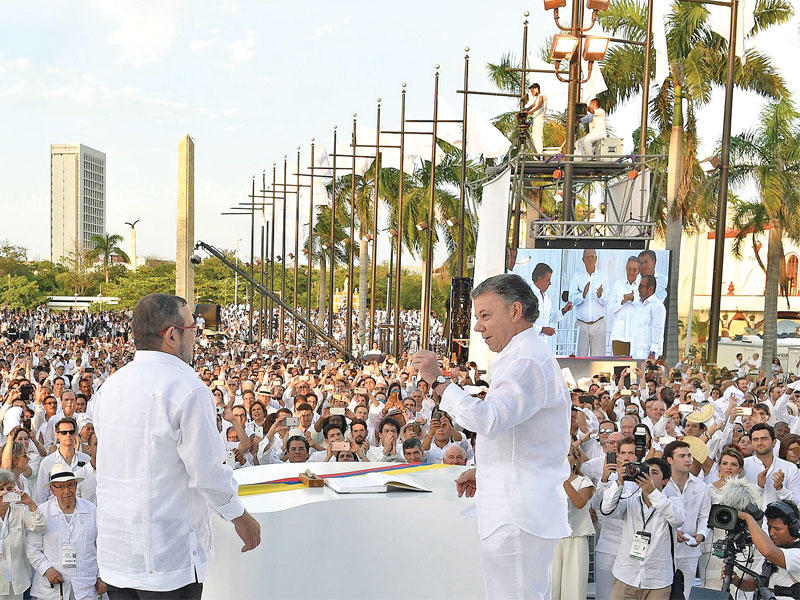 يتردد على نطاق واسع أن اتفاقا للسلام في كولومبيا ينهي حربا مستمرة منذ نصف قرن قد يرشح لجائزة نوبل للسلام الأسبوع المقبل، لتعود الجائزة إلى جذورها بعد فوز العديد من المنظمات منها الاتحاد الأوروبي.وقد يتشارك في الجائزة الرئيس خوان مانويل سانتوس، وزعيم المتمردين الماركسيين، بعد أن وقعا اتفاقا يوم 26 سبتمبر لإنهاء حرب قتل فيها نحو ربع مليون شخص.