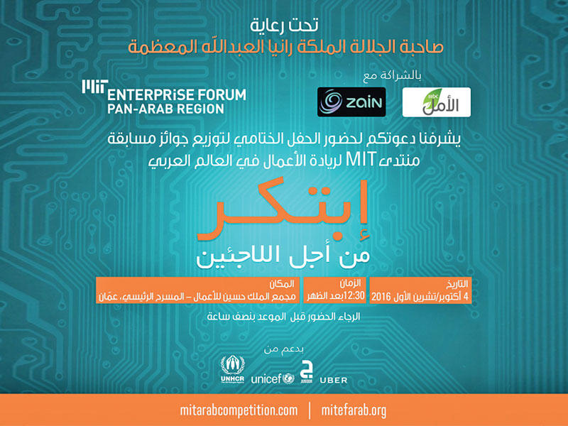 يستضيف "منتدى MIT لريادة الأعمال" في العالم العربي حفل توزيع جوائز مسابقة "ابتكر من أجل اللاجئين" تحت رعاية الملكة رانيا العبدالله، اليوم، على المسرح الرئيسي لمجمع الملك حسين للأعمال في العاصمة الأردنية عمان، والذي يهدف إلى تكريم الحلول الأكثر ابتكاراً والقائمة على التكنولوجيا للتخفيف من وطأة أزمة اللاجئين التي يشهدها العالم.وتم إطلاق المسابقة التي تقدم جوائز مالية بقيمة 110 آلاف دولار، في يونيو 2016 بالتعاون مع "مجموعة زين"، الرائدة في مجال تشغيل خدمات الاتصالات المتنقلة في منطقة الشرق الأوسط وإفريقيا، و"MBC الأمل"، ذراع المسؤولية الاجتماعية في مجموعة MBC، وبدعم من "المفوضية السامية للأمم المتحدة لشؤون اللاجئين"، ومنظّمة "جسور" غير الربحية، وشركة "أوبر".إلى جانب ذلك، حظيت المسابقة بدعم أكثر من 30 شريكاً آخر بما فيهم مؤسسة TechFugees و"لجنة الإنقاذ الدولية".