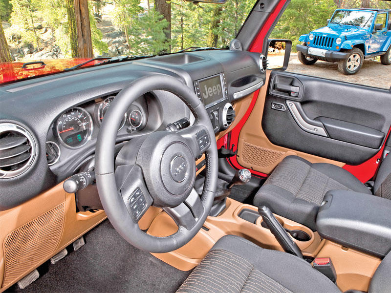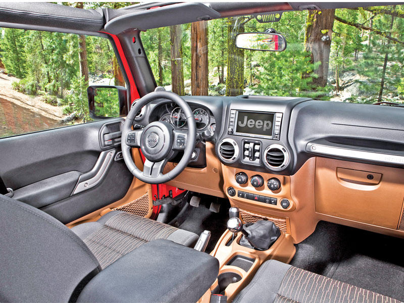 تشتمل رانغلر على مقاعد أمامية وخلفية ذات استدارة وبمساند كبيرة تحقق الراحة خلال الرحلات الطويلة، في حين تقدم المزيد من الدعم للأنشطة الرياضية على الطرق الوعرة. ويشتمل طراز رانغلر أنليميتد على مقبض جديد يؤدي مهمة طي المقعد الخلفي. وهذا المقبض يسمح بطي المقاعد بيد واحدة، ما يحقق المزيد من الراحة.وتتوافر الإضاءة بالمقصورة تحت لوحة أجهزة القياس وكذلك مناطق حامل الكؤوس للركاب بالمقاعد الأمامية والخلفية. وتأتي مرآة الكتروكرومية ذات إعتام ذاتي قياسية بجميع الطرازات، وتشتمل على أضواء مصباح LED للقراءة للركاب بالمقعد الأمامي. ويتوافر مكبر للصوت جديد ممتاز من نوعية Alpine، وذلك للأنظمة الصوتية المجهزة بنظام ملاحي، ونظام اختياري لمراقبة ضغط هواء الإطارات يعطي قراءة مباشرة لضغط هواء كل إطار على حدة. وتأتي مساحات زجاج مزدوجة الشفرة قياسية الآن، وتساعد في تنظيف الزجاج الأمامي من الأوحال والأوساخ بشكل ممتاز.كما تشتمل جيب رانغلر على مصابيح أمامية مستديرة كلاسيكية، والشبكة ذات الفتحات السبع، وأماكن كبيرة شبه منحرفة الشكل للعجلات، وأبواب قابلة للإزالة ومفصلات مكشوفة وزجاج أمامي قابل للانخفاض وأسطح وأنصاف أبواب مبتكرة وقابلة للإزالة والفتح مما يتيح لهذه الطرازات الاحتفاظ بالقيم الجوهرية للعلامة التجارية الشهيرة. ويتشارك طرازا رانغلر روبيكون وصحارى في خيار السقف الصلب بلون الهيكل الذي يمنح مظهراً رائعاً للسيارة.ومع مقصورة تتسع لخمسة أشخاص بالغين، تظل جيب رانغلر أنليمتد السيارة الوحيدة ذات الأربعة أبواب والسقف المكشوف المتوافرة في الأسواق.التصميم
