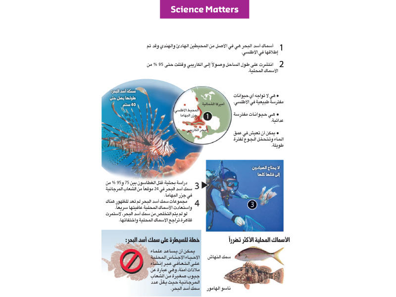 • هي حيوانات مفترسة عدائية.• يمكن أن تعيش في عمق الماء وتتحمّل الجوع لفترة طويلة. 3- دراسة بحثية: قتل الغطاسون بين 75 و95 % من سمك أسد البحر في 24 موقعاً من الشعاب المرجانية في جزر البهاما.4- مجموعات سمك أسد البحر لم تعد للظهور هناك واستعادت الأسماك المحلية عافيتها سريعاً.لو لم يتم التخلص من سمك أسد البحر، لاستمرت ظاهرة تراجع الأسماك المحلية واختفائها.