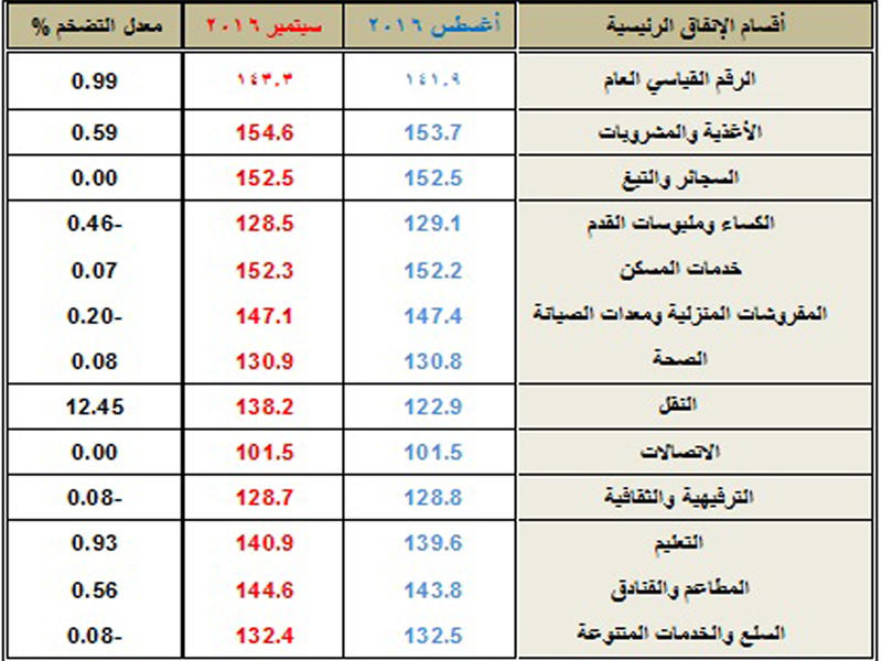 وأوضحت ان الرقم القياسي للمجموعة الرئيسية الأولى (الأغذية والمشروبات) ارتفع في سبتمبر الماضي بنسبة 0.78 في المئة مقارنة بالشهر ذاته من 2015 في حين شهدت المجموعة ارتفاعا على أساس شهري قدره 0.59 في المئة.وأشار الى ان أسعار ست مجموعات فرعية من المجموعة الأولى (الاغذية والمشروبات) ارتفعت على أساس شهري في حين انخفضت اسعار مجموعتين واستقرت اسعار مجموعتين أخريين مبينة ان الرقم القياسي استقر في المجموعة الرئيسية الثانية (السجائر والتبغ) على أساس شهري وارتفع 0.46 في المئة على أساس سنوي. ولفتت الادارة الى ارتفاع الرقم القياسي للمجموعة الثالثة (الكساء وملبوسات القدم) خلال سبتمبر الماضي بنسبة 0.78 في المئة على أساس سنوي فيما ارتفاعت نسبته 0.46 في المئة على أساس شهري في حين ارتفع معدل التضخم في المجموعة الرابعة (خدمات المسكن) 7.4 في المئة على أساس سنوي وارتفع في المجموعة الخامسة (المفروشات المنزلية ومعدات الصيانة) اثنين في المئة على أساس سنوي.وأفادت ان المجموعة السادسة (الصحة) شهدت ارتفاعا في معدل التضخم خلال سبتمبر الماضي بنسبة 1.87 في المئة على أساس سنوي في حين قفزت المجموعة السابعة (النقل) على أساس سنوي بنحو 10.56 في المئة وعلى اساس شهري بنسبة 12.45 في المئة وارتفعت المجموعة الثامنة (الاتصالات) على أساس سنوي 0.40 في المئة.وقالت ادارة الإحصاء ان معدل التضخم في المجموعة التاسعة (الترفيهية والثقافية) انخفض على أساس سنوي بنحو 0.8 في المئة في حين شهد ارتفاعا في المجموعة العاشرة (التعليم) على أساس سنوي في سبتمبر الماضي بنسبة 2.7 في المئة.وأضافت ان الرقم القياسي للمجموعة الرئيسية ال11 (المطاعم والفنادق) شهد ارتفاعا على أساس سنوي بنسبة 2.92 في المئة كما شهدت المجموعة الأخيرة (السلع والخدمات المتنوعة) ارتفاعا سنويا بنسبة 1.85 في المئة.ويعد الرقم القياسي لأسعار المستهلك أداة لقياس التغير بمستويات الأسعار عموما بين فترتين إما شهرية أو سنوية وعادة ما يكون مؤشرا أساسيا لقياس التضخم أو الانكماش الاقتصادي إذ يمكن للدولة من خلاله اتخاذ القرارات الاقتصادية والتجارية ورسم السياسات النقدية والمالية.وكانت منهجية الأرقام القياسية لأسعار المستهلك لسنة الأساس الجديدة 2007 استندت إلى البيانات المستخلصة من 455 مصدرا من محافظات البلاد الست في وقت ضمت فيه سلة المستهلك الجديدة السلع والخدمات الأكثر استخداما بين الأفراد والأسر التي تم اختيارها خلال بحث الدخل والانفاق الأسري.