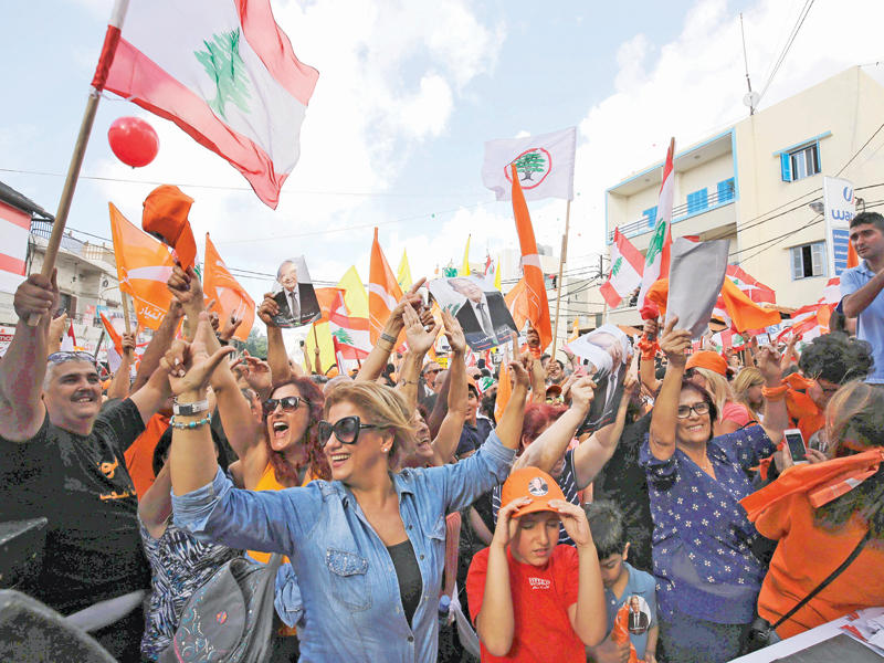 فور اعلان فوز عون عمت الاحتفالات المناطق المسيحية خصوصاً، وشهدت بعض القرى نحر خراف، كما شوهدت للمرة الاولى اعلام «القوات» و«حزب الله» و«التيار الوطني الحر» متجاورة»، وفي الصورة جانب من الاحتفالات في مدينة البترون الساحلية شمال العاصمة أمس (أ ف ب)