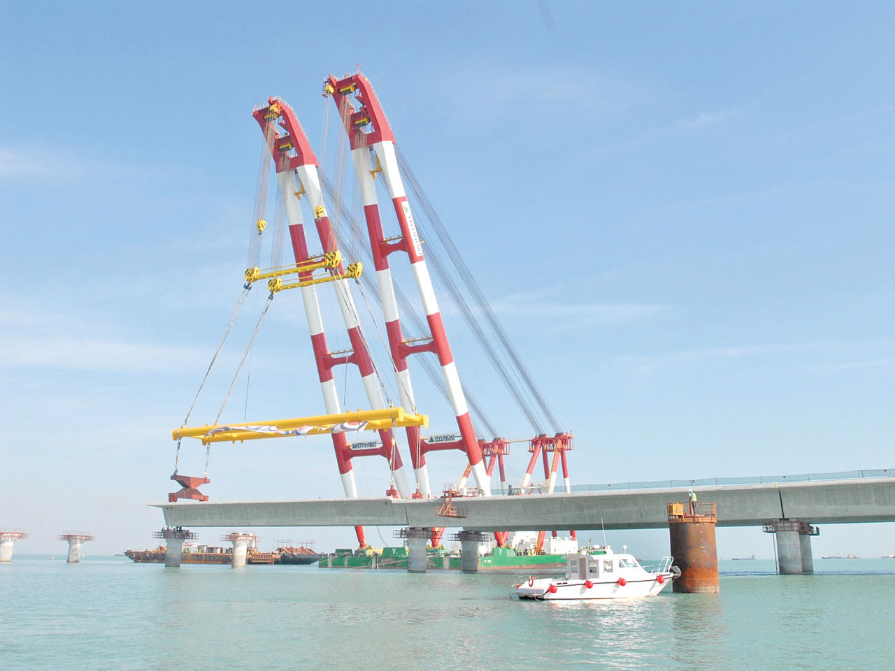 وأوضح أن المشروع يعد من المشروعات الكبرى التي تنفذها الوزارة للمساهمة في تحقيق الرؤية السامية بتحويل الكويت إلى مركز مالي وتجاري اقليمي وعالمي.وبيّن أن المشروع يختصر الفترة الزمنية المستغرقة للمسافة بين مدينة الكويت العاصمة ومدينة الحرير التي تستهدفها الخطط الإستثمارية للدولة كأحد ركائز التنمية ورافداً جديداً لمصادر الدخل الوطني. وأشار إلى أن أعمال المشروع تتضمن إنشاء جسر بحري بطول 36.14 كيلو متر تقريباً عبر جون الكويت يبدأ من تقاطع طريق (الغزالي) السريع مع شارع (جمال عبدالناصر) حتى طريق الصبية السريع وصولاً إلى مدينة الصبية الجديدة في الجانب الشمالي لجون الكويت.وذكر أن أعمال المشروع البالغة كلفته 738.750 مليون دينار تشمل انشاء جسر طوله 27 كيلو متراً بارتفاع منخفض عبر الجون مع جسر رئيسي مرتفع عبر الممر الملاحي بفراغ ملاحي عرضه 120 متراً وارتفاع 23 متراً لمرور السفن إلى ميناء الدوحة.وأفاد الحصان بأن المشروع يتضمن أيضاً إنشاء جزيرتين اصطناعيتين الأولى قرب مدينة الكويت والثانية قرب مدينة الصبية بهدف توفير خدمات الصيانة والطوارئ وحرس السواحل إلى جانب الطريق المؤدي إلى شاطئ الصبية بطول ستة كيلو مترات.ولفت إلى المتابعة الحثيثة التي تقوم بها (الأشغال) لمشاريعها التنموية لاسيما مشاريع قطاع هندسة الطرق ومشروع جسر الشيخ جابر الأحمد بوصلتيه (الصبية) و(الدوحة) بما يحقق نقلة نوعية في مسيرة التنمية في البلاد كونه "رابع أكبر جسر في العالم".وقال أن المدة الزمنية للمشروع تبلغ 1827 يوماً حيث بدأت أعماله في الثالث من نوفمبر عام 2013 على أن يتم انجازه في الثالث من نوفمبر عام 2018 مثمناً جهود كل الأطراف العاملة بالمشروع في سبيل دفع وتيرة العمل والتغلب على العقبات التي قد تواجه العمل.