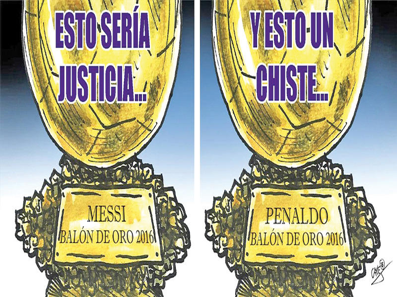 كاريكاتير الأسبوع : سخرت صحيفة سبورت الكتالونية من البرتغالي كريستيانو رونالدو مهاجم نادي ريال مدريد الإسباني بسبب مزاعم اقترابه من الفوز بجائزة «الكرة الذهبية» لموسم 2015-2016.وأوضحت الصحيفة من خلال رسم «الكاريكاتير» الخاص بها ، أن الأرجنتيني ليونيل ميسي مهاجم برشلونة يستحق الجائزة أكثر إذا ما كان هناك عدل.