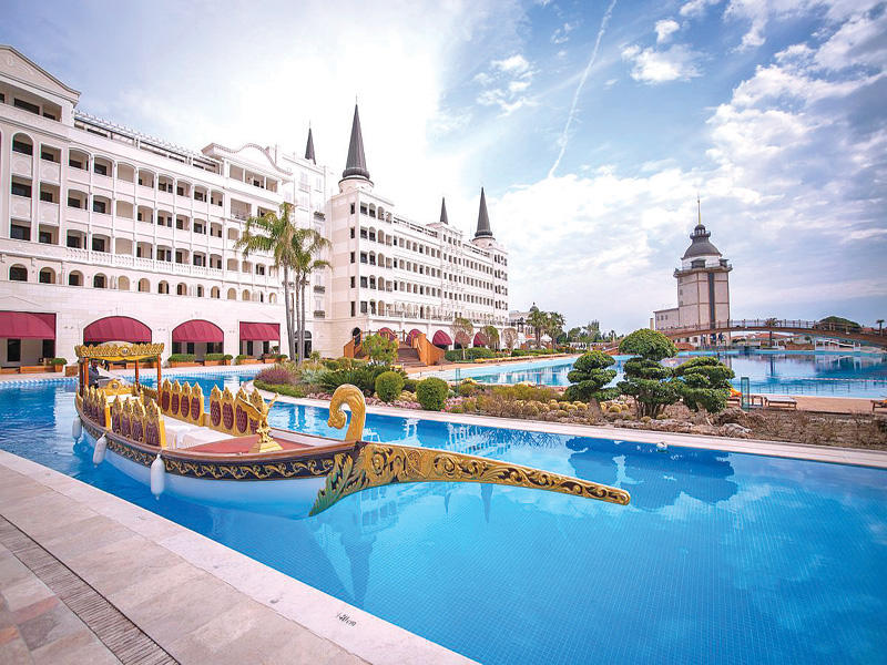 في الطريق من المطار إلى أنطاليا، يمكن للزائر أن يشاهد إطلالة مميزة لفندق «مرادان بالاس» بتصميمه وشكله المميز. وعند دخوله تظهر صالة الاستقبال الواسعة جداً كلوحة فنية أبدع مصممها بتزيينها بأجمل النقوش والزخارف. أما أجنحة الفندق الملكية وغرفه الفاخرة ومطاعمه الثمانية فجعلته ضمن قائمة أجمل وأفخم وأغلى الفنادق في أوروبا.الفندق الرائع يملكه الملياردير الآذري تالمان اسماع ليلوف، وبلغت تكاليفه نحو 1.4 مليار دولار. وليس ذلك مستغربا إذا ما علمنا أن الكثير من مكوناته وأقسامه الداخلية استخدم الذهب الخالص في تزيينها.الفندق لا يشبهه سوى قصور «ألف ليلة وليلة»، ويمتد على مساحات واسعة، وتوفر إدارته عربات خاصة لنقل رواده الى مكوناته المختلفة من الفلل الفاخرة المنتشرة على أطرافه، والتي أُنشئت لتوفير مزيد من الخصوصية للراغبين في النزول إلى الشاطئ للتمتع بوقت جميل في مياه البحر أو إلى المطعم المحاذي للشاطئ الذي يقدم ما لذ وطاب من المأكولات التركية والمشروبات والعصائر المتنوعة.مطاعم