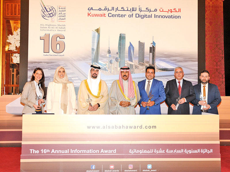 تحت رعاية صاحب السمو أمير البلاد الشيخ صباح الأحمد تفضل سمو نائب الأمير وولي العهد الشيخ نواف الأحمد فشمل بحضوره، صباح أمس، حفل تكريم الفائزين في السنة السادسة عشرة لجائزة سمو الشيخ سالم العلي للمعلوماتية، بقصر بيان.وقد شهد الحفل كبار الشيوخ وسمو الشيخ ناصر المحمد وسمو رئيس مجلس الوزراء الشيخ جابر المبارك والوزراء والمحافظون وكبار المسؤولين بالدولة.بدأ الحفل بالنشيد الوطني، ثم تلاوة آيات من الذكر الحكيم، بعدها ألقت رئيسة مجلس الأمناء الشيخة عايدة السالم كلمة ثمّنت في مستهلها الرعاية السامية للمناسبة، وقالت إن خيوط المستقبل ينسجها إنسان الحاضر المبدع في علوم التقنية المسارع إلى الانتفاع بها وهو يسابق عقارب الزمن نحو الآفاق الإنسانية القادمة، لافتة إلى أن مؤسسة سمو الشيخ سالم العلي للمعلوماتية تشارك في صناعة تلك الخيوط المستقبلية بما تملك من قدرة على قراءة الواقع وابتكار أفكار التغيير وإعداد أدوات التطوير، حفاظا على هويتنا وتعزيزا لثقافتنا ونهوضا باقتصادنا، تخليدا لاسم الكويت في صفحات التاريخ ومنطلقا لطريق الحرير الرقمي.وأضافت أن أرفع درجات القيادة هي تلك التي تتميز برؤى حكيمة تدفع إلى العطاء بابتكار، وإلى الإنجاز بإبداع، وقد كانت رؤى اصحاب السمو ضياء نستنير به في رؤانا وأهدافنا وفي ابتكارنا وإبداعنا، وهذا من كرم رعايتهم ووافر عطائهم، فلمقامهم السامي شكر الأحباء وامتنان الأوفياء.