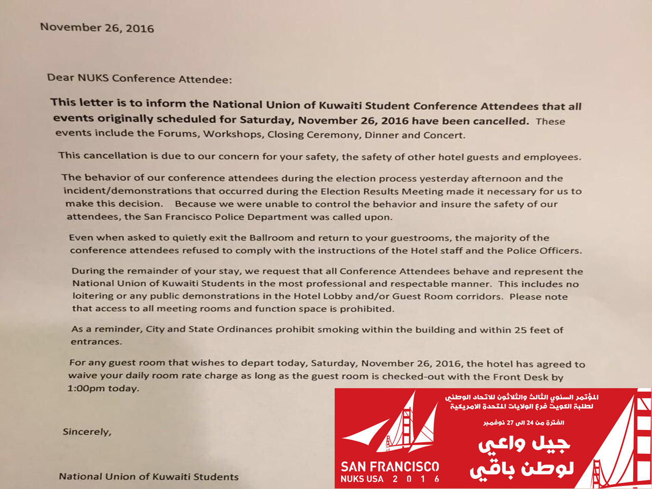 أعلن الاتحاد الوطني لطلبة الكويت فرع الولايات المتحدة الأمريكية الغاء اليوم الأخير من فعاليات المؤتمر الـ 33 للاتحاد الذي ينعقد بمدينة فرانسيسكو بولاية كاليفورنيا الأمريكية حالياً لأسباب أمنية.وقال الاتحاد في رسالة وجهها للطلبة الكويتيين أن الغاء فعاليات يوم السبت جاء «حفاظاً على سلامة الطلبة والعاملين»، لافتاً إلى أن فعاليات اليوم الأخير تضم ورش عمل ومنتدى والحفل الختامي.