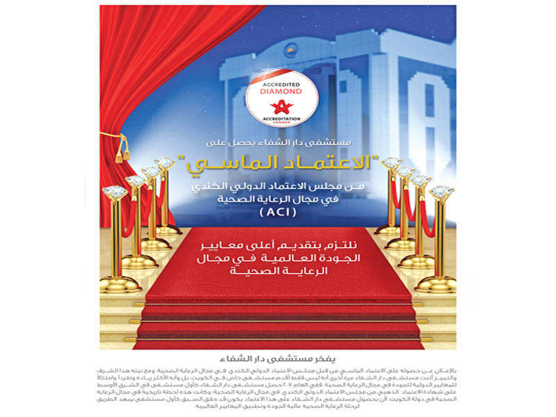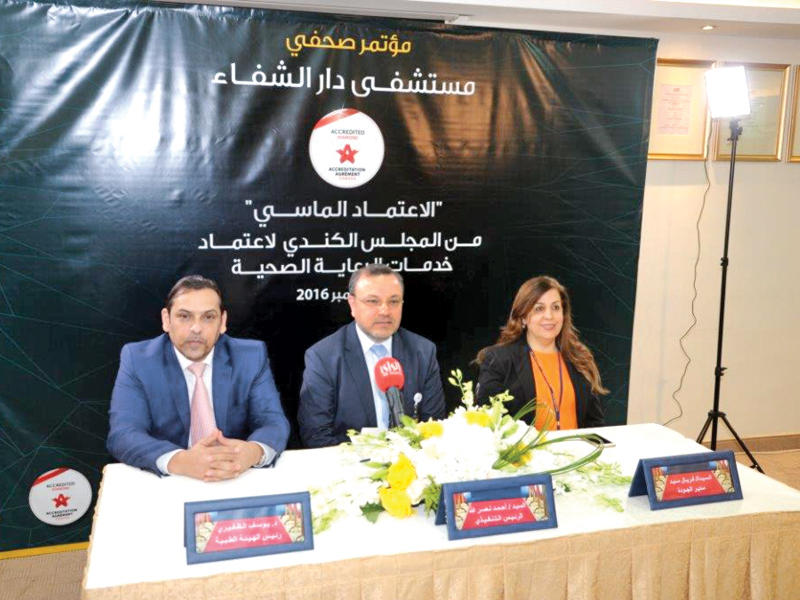 عقد مستشفى دار الشفاء مؤتمرا صحافيا الخميس الماضي أعلن خلاله حصوله على شهادة الاعتماد الماسي من مجلس الاعتماد الدولي الكندي في مجال الرعاية الصحية (ACI)، وهو جهة عالمية رائدة في مجال تقييم مستوى جودة الرعاية الصحية، حيث استطاع المستشفى أن يحظى بهذا الاعتماد نتيجة تطبيقه أعلى معايير الجودة العالمية المتبعة في مجال الرعاية الصحية.حضر المؤتمر عدد كبير من العاملين في المستشفى من مختلف الأقسام الطبية والإدارية، وعلى رأسهم طالب جراق، رئيس مجلس إدارة مستشفى دار الشفاء، والذي أشاد بالمجهود والعمل المضني الذي بذله كل عضو في فريق عمل المستشفى من أطباء وممرضين وفنيين وإداريين لتحقيق هذا الإنجاز، والوصول بالمستشفى إلى أعلى معايير الجودة والأمان والسلامة العالمية، وتعهد بمواصلة مسيرة العطاء والتطور المستمر، للتأكد من حصول المرضى على أفضل الخدمات الصحية عالية الجودة.