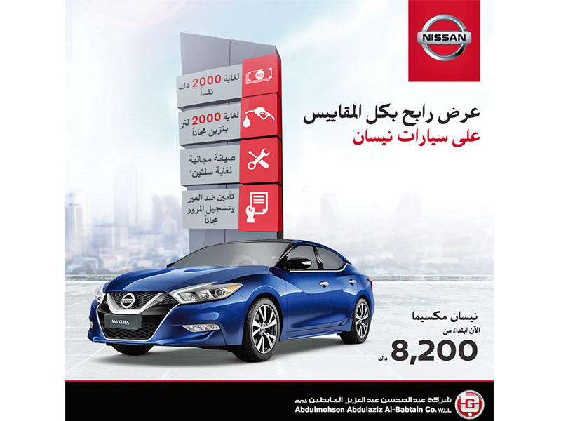 تستمر شركة عبدالمحسن عبدالعزيز البابطين، الوكيل المعتمد لسيارات نيسان بالكويت، في حملة "عرض رابح بكل المقاييس"، بجعل عملية تملك سيارة نيسان أفضل للعملاء في السوق الكويتي، مع العرض الخاص الذي أطلقته، والذي تمنح من خلاله الفرصة للفوز بجوائز متنوعة عند شراء سيارة نيسان من معارضها.وأشارت "نيسان البابطين" إلى أنه عند شراء السيارة، يمكن للعملاء الاستفادة من مجموعة واسعة من الجوائز التي تتراوح من ربح نقدي لغاية 2000 دينار، وبنزين مجاني حتى 2000 لتر، وباقة خدمة وصيانة مجانية لغاية سنتين، إضافة إلى تأمين ضد الغير وتسجيل المرور مجانا.
