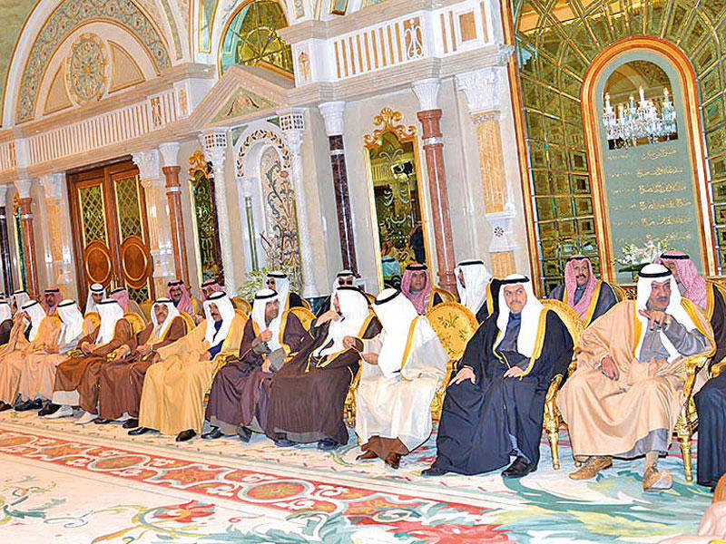 سمو الأمير وضيفه الكبير يتوسطان كبار الشيوخ وأعضاء الوفد المرافق للملك سلمان