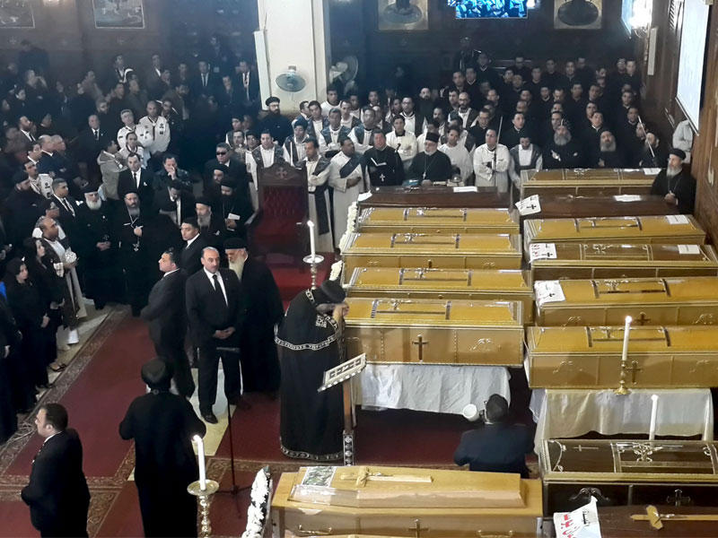 كانت جثامين ضحايا "البطرسية"، وصلت إلى كنيسة السيدة العذراء مريم في ضاحية مدينة نصر، شرق القاهرة، وقالت وكالة أنباء الشرق الأوسط، إن الأجهزة المعنية نصبت 3 سرادقات للعزاء بطريق النصر، بجانب النصب التذكاري للجندي المجهول. وأعلنت الكنيسة المصرية، مساء أمس الأول، إقامة قداس الجنازة أمس، على الضحايا في كنيسة العذراء والقديس إثناسيوس في مدينة نصر، برئاسة قداسة البابا تواضروس، وقال البابا لمواساة أسر الشهداء: "إن الله أراد أن يكرم الضحايا بأن يكونوا شهداء وهم صائمون ويصلون، كما أن الجميع يودع هذه النفوس في بداية شهر التسبيح والفرح".وأضاف خلال كلمة ألقاها أمام الأقباط بعد انتهاء القداس الإلهي: "نودع هذه النفوس وكلنا رجاء، وقدر كنيستنا المصرية أن تقدم الشهداء، ولذلك تم تسميتها كنيسة الشهداء منذ القرون الأولى"، وتابع: "منذ بدأت مسيحيتنا قدم عدد كبير من الأطفال نفوسهم واعتبرناهم باكورة شهدائنا، وهم أطفال بيت لحم"، ودعا الأقباط إلى التصبر والثبات، والصلاة دائما، مضيفا: "علينا جميعا أن ندرك أن الموت ينتظرنا في أي وقت... استعدوا جميعا إلى الموت والأبدية، وليحفظ الله بلادنا من كل شر".