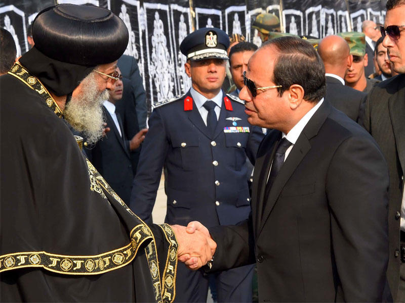وسط أجواء جنائزية حزينة، تقدم الرئيس المصري عبدالفتاح السيسي وبابا الأقباط بطريرك الكرازة المرقسية، تواضروس التاني، وكبار رجال الدولة، أمس الجنازة الرسمية، للعشرات من ضحايا الأقباط، الذين قضوا نتيجة العملية الإرهابية التي استهدفت "الكنيسة البطرسية" الملحقة بالمقر الباباوي بالكاتدرائية المرقسية، أمس الأول.وقدم السيسي تعازيه للبابا تواضروس، كاشفا عن هوية مرتكب العملية الإرهابية، وقال إنه انتحاري ارتدى حزاما ناسفا، ويبلغ من العمر 22 عاما، ويدعى "محمود شفيق محمد مصطفى"، وتابع: "تم القبض على 4 أشخاص بينهم سيدة، وبقي اثنان آخران".الرئيس المصري، الذي بدا واثقا بقدرات الأجهزة الأمنية، شدد على أن العملية لم تتم نتيجة خلل أو اختراق أمني، مشيرا إلى أن العملية تستهدف النيل من وحدة المصريين، وأنها تعكس حالة الإحباط لدى الجماعات الإرهابية التي فشلت في إحداث الوقيعة والفرقة بين المصريين خلال الفترة الماضية، وتابع قائلا: "الضربة وجعتنا، بس عمرها ما هتكسرنا، والحرب دي هنكسبها".