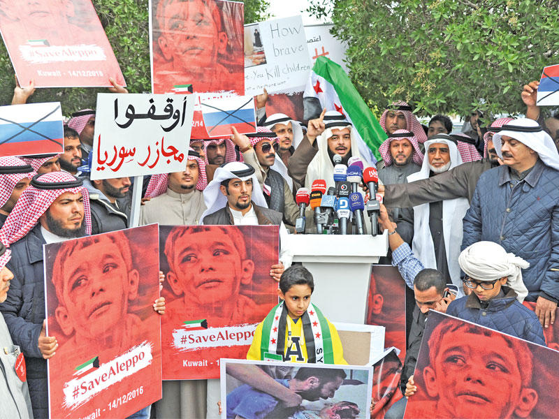 شهدت الكويت وقفة احتجاجية رسمية وشعبية نصرة لحلب، في وقت عاش آلاف المدنيين السوريين حالة من الذعر والرعب، بعد أن تجددت المعارك إثر عرقلة الاتفاق الذي تم التوصل إليه لإجلائهم إلى أماكن آمنة.