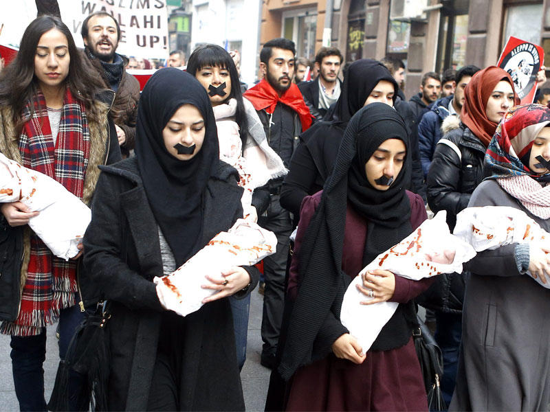 جانب من تظاهرة تضامنية مع حلب في سراييفو بالبوسنة والهرسك أمس (اي بي أيه)