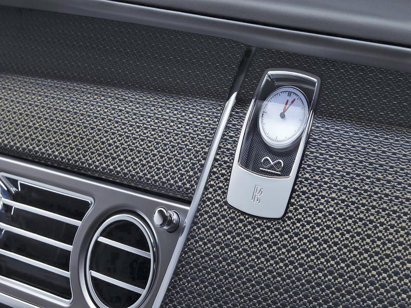 يظهر رمز "اللا نهاية" مطرّزاً على فرش بلاك بادج حيث يتناغم الجلد الأسود مع الألوان النابضة مثل البنفسجي Tailored Purple في غوست بلاك بادج والأزرق Cobalto Blue في رايث بلاك بادج، مما يمنح المقصورة شعوراً أكثر فخامة.وتبقى اللمسات الأخيرة للإضاءة المميّزة التي تصبّ من بطانة السقف المرصّعة بالأضواء كالنجوم وتنعكس حول المقصورة من لوحة العدادات المصقولة لتقدّم أجواءً معتمة متميّزة.ساعة خاصة