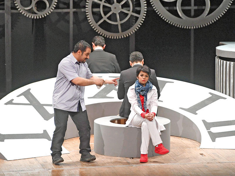 من جانبه، قال المسؤول عن السينوغرافيا، نواف الديحاني، إن عناصر السينوغرافيا حملت رسالة ليست بعيدة عن النص نفسه، وهي أن هذا الزمن الذي نعيشه تشوبه التعاسة، حيث تأخذنا المسرحية عبر شخصيتين، هما «هو» و»هي»، ضمن الأشخاص الذين يتعرضون للعديد من المشكلات الاجتماعية والضغوط النفسية، لتجعلهم يفقدون الإحساس بالوقت والسعادة بحياتهم، فيعيشون منعزلين، ونرى الزمن يمشي ولا ينتظر أحدا، والناس تعيش غير مبالية أو مكترثة بغيرها.تميز العمل من خلال الأداء التمثيلي الحركي بمشاركة المؤثرات الصوتية والموسيقية، وكان الحوار بين شخوص المسرحية واضحا، وتضمن بعض الأبعاد السياسية والاجتماعية، واتجه الديكور إلى المدرسة الرمزية من خلال قطعة كبيرة وضعت على سطح المسرح تمثل الساعة، وعلى الحائط وضعت قطع هندسية وأجزاء من الساعة تم توزيعها، مما انعكس على حركة الممثلين فكانوا أكثر حرية.شارك ضمن فريق العمل العازفان تامر إبراهيم ومحمد عبدالرحمن، وكان مدير الخشبة نواف البحراني، بينما تصدى لتصميم الإضاءة أيمن عبدالسلام، وصمم السينوغرافيا نواف الديحاني، وملابس وخدع بدر بوعباس ومكياج عبدو الطقش وموسيقى ومؤثرات وليد سراب.