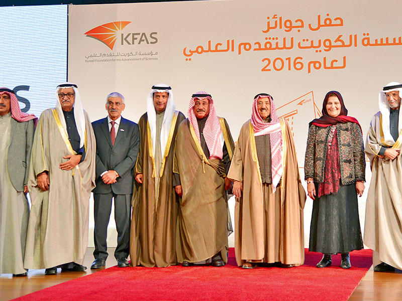 منحت مؤسسة الكويت للتقدم العلمي (جائزة الكويت لعام 2016) في ثلاثة مجالات على النحو الاتي:"العلوم الأساسية - الفيزياء" فاز فيها الدكتور جورج الحلو (لبناني)، ويشغل منصب مدير مركز المعالجة والتحليل الطيفي في نطاق الأشعة تحت الحمراء، وأستاذ الفيزياء في جامعة كالتك بولاية كاليفورنيا الأميركية."العلوم التطبيقية - الغذاء والزراعة" فاز بالجائزة الدكتور سفيان كمون (تونسي)، وهو أستاذ علم الأحياء في جامعة انجليا الغربية، وكبير الباحثين في مختبر سينسبري بمركز جون إينيس في المملكة المتحدة، لريادته في علم الأمراض النباتية."الفنون والآداب - دراسات في الفنون التشكيلية والمسرحية والموسيقية" وفاز بها مناصفة، كل من الدكتورة نهاد صليحة أستاذة الدراما والنقد في المعهد العالي للنقد الفني بأكاديمية الفنون في مصر، لتميزها في الحركة المسرحية المصرية والعربية والعالمية، والدكتور عفيف البهنسي (سوري)، نظير الدراسات المعمقة التي أجراها، وتناولت الجوانب الجمالية المميزة في التراث العربي.وحجبت الجائزة في (مجال العلوم الاقتصادية والاجتماعية) عن موضوع العلوم المالية والمصرفية.وفاز 4 باحثين بجائزة الإنتاج العلمي لعام 2016 في أربعة مجالات كالاتي: "مجال العلوم الطبيعية والرياضية" وفازت فيه الدكتورة حليمة الكندري، الأستاذة المشاركة في كلية العلوم الصحية بقسم صحة البيئة في الهيئة العامة للتعليم التطبيقي والتدريب."مجال العلوم الهندسية" وفاز فيه الدكتور عيسى الصفران، أستاذ هندسة البترول بكلية الهندسة والبترول في جامعة الكويت."مجال العلوم الطبية والطبية المساعدة" وفاز فيه الدكتور وليد الحرز، أستاذ قسم الأطفال بكلية الطب في جامعة الكويت، و"مجال العلوم الاجتماعية والإنسانية" وفاز فيه الدكتور عبدالله القتم، أستاذ اللغة العربية وآدابها بكلية الآداب في جامعة الكويت.أما "جائزة الإنتاج العلمي" فقد حجبت في مجالي "العلوم الحياتية" و"العلوم الإدارية والاقتصادية".وفاز ثلاثة باحثين عرب في "جائزة أنور النوري لأفضل أطروحة دكتوراه في التربية في العالم العربي"، وحلت في المركز الأول الدكتورة أميرة طريش (من فلسطين)، عن أطروحتها "تحليل مقارن لعلامات الكفاءة لطلبة الجامعات في الإمارات العربية المتحدة: فعالية استخدام اللغة الأم عند تعليم القراءة بلغة ثانية".وفاز في المركز الثاني (مناصفة) الدكتور ناصر الريس (من السعودية)، عن أطروحته "الاعتماد المدرسي في مراحل التعليم العام بالمملكة العربية السعودية"، والدكتورة دلال رزق الله (من لبنان)، عن أطروحتها "تطوير معايير التقييم الذاتي التشاركي وإجراءاته بحسب مجتمع التعلم المهني".