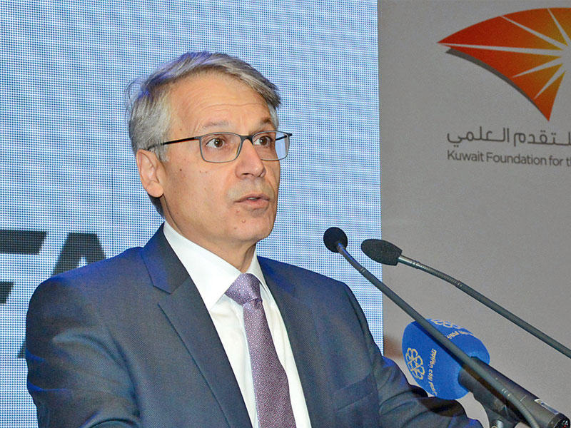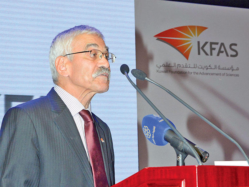 ثم ألقى المدير العام للمؤسسة د. شهاب الدين كلمة اعتبر فيها ان اللقاء الذي يتجدد كل عام في ظل الرعاية السامية والحضور الكريم من صاحب السمو، رئيس مجلس إدارة مؤسسة الكويت للتقدم العلمي، لتكريم نخبة من العلماء والباحثين الكويتيين والعرب يشكل دلالة واضحة على إيمان سموه بأهمية العلم ودوره الحيوي في إرساء نهضة حضارية ذات اقتصاد مستدام. مضيفا ان الاحتفال هو لتكريم العلماء الذين فازوا بجائزة الكويت وجائزة الإنتاج العلمي لعام 2016، وبجائزة أنور النوري لأفضل أطروحة دكتوراه في التربية في العالم العربي التي تقدمها المؤسسة للمرة الأولى بمبادرة وتمويل مقدرين من "مبرة أنور النوري".وقال شهاب الدين: "يتزامن احتفالنا مع إكمال العام الأخير من الخطة الاستراتيجية الخمسية للمؤسسة التي حفلت بإنجازات عديدة تضمن الفيلم الذي شاهدناه إشارة إلى أهمها، فضلا عن إنجازات كثيرة أخرى، فشهد هذا العام بدء العمل في (دسمان للسكري) اتفاقية مع وزارة الصحة لدعم وتمويل ما يقدمه من خدمات طبية وتدريبية للوزارة.وأكملت المؤسسة في نوفمبر الماضي إعداد خطتها الاستراتيجية الخمسية الجديدة، استنادا إلى تقييم عالمي لأداء برامجها ومراكزها بالعامين الماضيين، وإلى استقصاء مستقل لآراء كبار الشركات والمستفيدين لمعرفة أوليات المجالات التي يجب تركيز أنشطة المؤسسة عليها في الاستراتيجية الجديدة والتي جاءت بصيغة برامج منضوية تحت ثلاثة محاور يستهدف أولها رفع مستوى وعي الجماهير بالعلوم وتحسين تعلمها بالتعاون مع وزارة التربية وتعزيز نشر الثقافة العلمية عبر الوسائط الإلكترونية الموجهة للناشئة.فيما تضمنت الخطة تحولا أعمق في برامج المحور الثاني من بناء القدرات البحثية إلى تسخيرها لإيجاد حلول ناجعة لمعوقات التنمية المستدامة، إضافة الى السعي بالتعاون مع المؤسسات العلمية الحكومية لمضاعفة مستوى الإنفاق الحكومي على البحث العلمي في الكويت ليبلغ على الأقل نحو واحد في المئة بحلول عام 2020. والإسراع في إنشاء مجلس وطني للبحث العلمي لتحديد أهم الأولويات وتأمين تمويلها".مشاريع كبرى