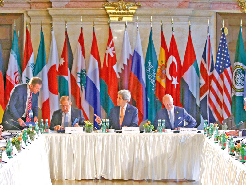 في أول اجتماع لها في فيينا منذ إعلان اتفاق وقف إطلاق النار المتداعي في سورية، حاولت في 18 مايو مجموعة الدعم الدولية برئاسة الولايات المتحدة وروسيا وعضوية 17 بلدا وثلاث منظمات دولية، وضع الأمور المنفلتة على المسار الصحيح عبر تثبيت الهدنة وإيصال المساعدات كخطوة تمهيدية لإعادة إطلاق مفاوضات "جنيف 3" وتسريع الانتقال السياسي، وفق خريطة طريق توصلت إليها نهاية العام الماضي ووافق عليها مجلس الأمن.تفجيرات «السيدة»