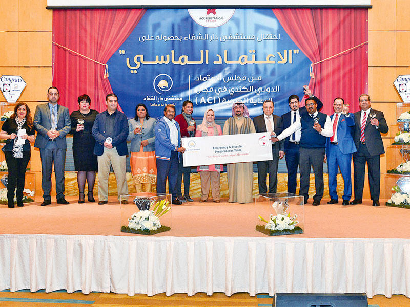 أقام مستشفى دار الشفاء حفلا لتكريم لجميع العاملين به في قاعة سلوى الصباح بفندق المارينا، وذلك بمناسبة حصول المستشفى على شهادة الاعتماد الماسي من مجلس الاعتماد الدولي الكندي في مجال الرعاية الصحية (ACI) التي تعد جهة عالمية رائدة في مجال تقييم مستوى جودة الرعاية الصحية.فقد استطاع المستشفى أن يحظى بهذا الاعتماد، نتيجة تطبيقه أعلى معايير الجودة العالمية المتبعة في مجال الرعاية الصحية.حضر الحفل عدد كبير من العاملين في المستشفى، وعلى رأسهم عضوة مجلس الإدارة نرجس اليوسفي، نائب رئيس مجلس الإدارة بدر جراق، الرئيس التنفيذي بالمستشفى أحمد نصرالله، وعدد من أعضاء مجلس الإدارة.