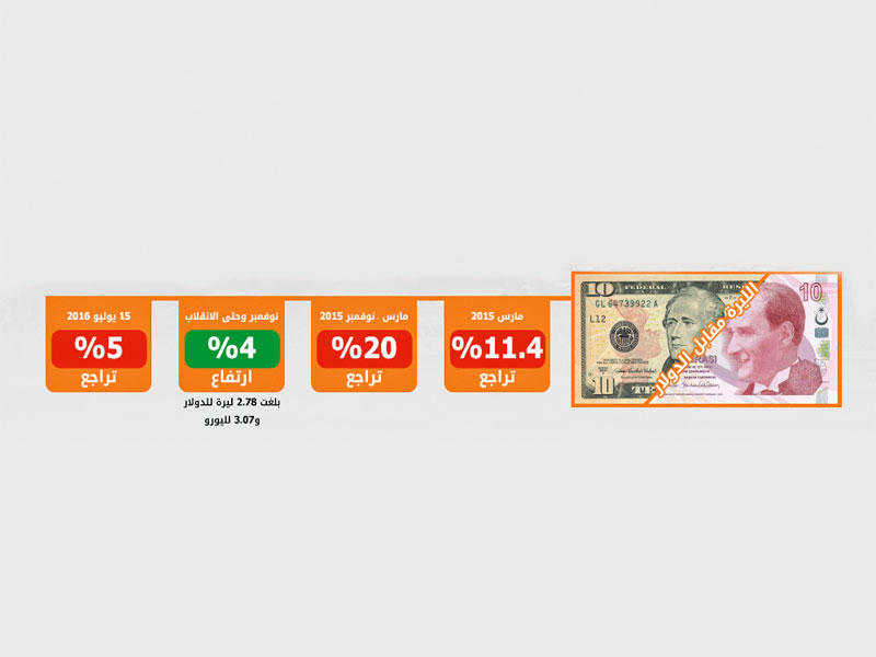 تشهد الليرة التركية كل أسبوع تراجعا قياسيا أمام الدولار، بسبب الغموض السياسي وتوتر الوضع الأمني في البلاد.وتدهور سعر صرف الليرة وبلغ أدنى مستوى له مقابل الدولار، إذ وصل سعر صرفها إلى 3.5 ليرات لكل دولار، بعد خسائر بلغت 10 في المئة الشهر الماضي. وتبدو الأسواق قلقة من التدخلات المتكررة لإردوغان في الشؤون الاقتصادية.