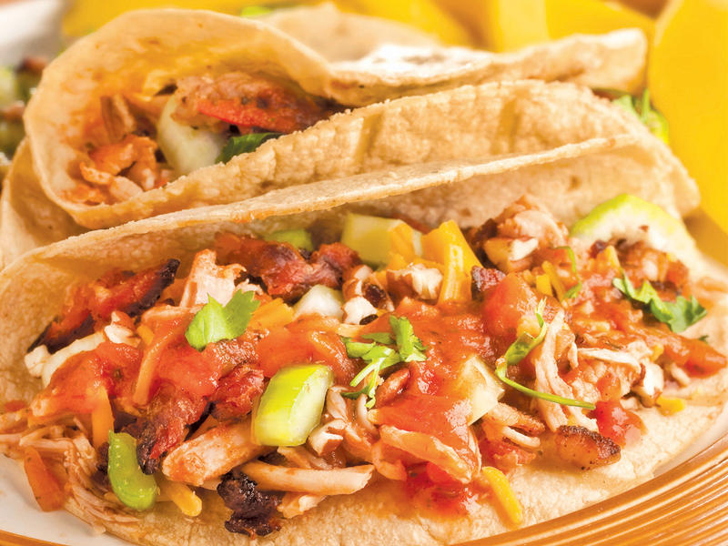 • ابشري البطاطا المسلوقة بشراً خشناً.• قطعي الديك الرومي.• قلي البصل في المقدار الذي ترغبين فيه من الزبدة غير المملحة (من 6 ملاعق كبيرة إلى قالب) إلى أن يصبح شفافاً وتملأ رائحته المطبخ. أما إذا رغبت في إضفاء نكهة حارة على هذا الطبق، فأضيفي رقاقات الفلفل الحار إلى الخليط. أضيفي بعد ذلك البطاطا المبشورة، قبضة كبيرة من الديك الرومي المطهو والمقطع، وكمية كافية من الملح والفلفل وتابعي القلي لنحو 20 دقيقة مع تحريك الخليط من حين إلى آخر إلى أن تحصلي على مزيج ذهبي داكن.• وزعي الخليط على 3 أو 4 أطباق وغطيه ببيض مقلي محمص الأطراف. التحضير: 15 دقيقة.مدة الطهو: 30 دقيقة.تاكو الديك الرومي