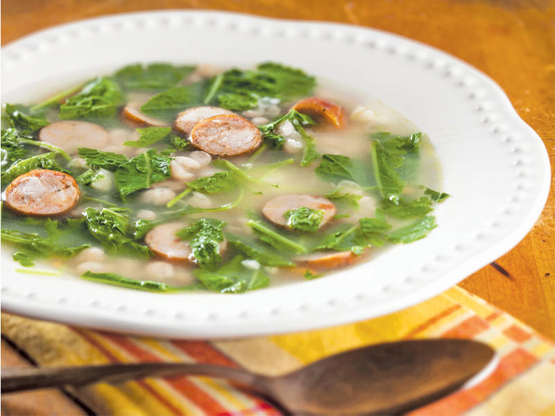 • ملعقتان كبيرتان من زيت الزيتون.• فصا ثوم مسحوقان.• كوبان من الفاصوليا البيضاء المطهوة أو علبتان (زنة كل منهما 400 غرام) منها مصفاتان ومغسولتان.• ليتر من مرق الدجاج المنزلي الصنع أو المعلب قليل الملح.• 3 إلى 4 أكواب من الكالي المقطع.• نصف ملعقة صغيرة من الملح أو حسب الذوق.• كوب من فضلات الديك الرومي أو الدجاج أو النقانق المطهوة (اختياري).• قرن فلفل حار طازج مقطع بالطول إلى عيدان صغيرة.الطريقة: