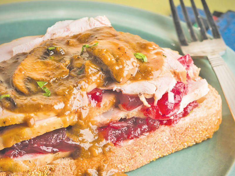 • شريحة من الخبز الريفي المقرمش أو الخبز الفرنسي المقطوع في الوسط إلى شريحتين متصلتين.• بعض بقايا الديك الرومي (سخنيها).• صلصة العنبية الحامضة.• مرق الحبش الساخن (أو يمكنك إعداد صلصة الديك الرومي والفطر).• سوق بقدونس طازجة.الطريقة: