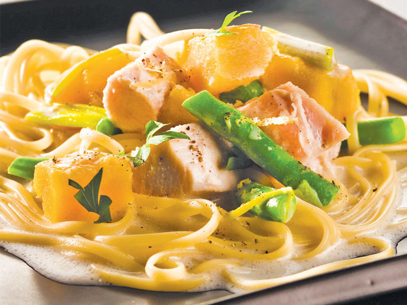 • 225 غراماً من الفيتوتشيني.• ملعقة كبيرة من الزيت النباتي.• 5 بصلات خضراء مقطعة عرضياً.• ثلاثة فصوص ثوم مسحوقة.• ملعقة صغيرة من معجون الكاري الأخضر التايلندي.• علبة (425 غراماً) من مرق الدجاج.• نصف علبة زنتها 425 غراماً من حليب جوز الهند.• كوبان من الديك الرومي المطهو المقطع إلى مكعبات.• كوب من كل من مكعبات اليقطين المطهو والفاصوليا الخضراء المطهوة.• نصف ملعقة صغيرة من الملح.• بشر ليمون حامض.• كزبرة مقطعة (اختياري).الطريقة: