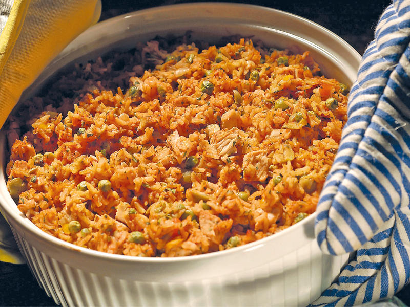 • ملعقتان كبيرتان من زيت الزيتون.• نصف كوب من كل من البصل والفليفلة المفرومين.• كوب ونصف الكوب من الأرز قصير الحبة.• ملعقة صغيرة من البابريكا المدخنة، الحارة أو الحلوة.• علبتان (زنة كل منهما 300 غرام) من مرق الدجاج.• ملعقة صغيرة من الملح.• ربع ملعقة صغيرة من خيوط الزعفران (اختياري).• فلفل أسود مطحون طازج.• علبة (225 غراماً) من الطماطم المقطعة.• كوبان ونصف كوب من شرائح الديك الرومي أو الدجاج.• مرطبان (200 غرام) من الزيتون الأخضر الإسباني المنزوع النواة والمقطع.• كوب من فضلات البازيلاء، والفاصوليا الخضراء المقطعة، أو أي نوع آخر من الخضراوات (اختياري).• نصف كوب من الكزبرة أو البقدونس المفرومة.الطريقة: