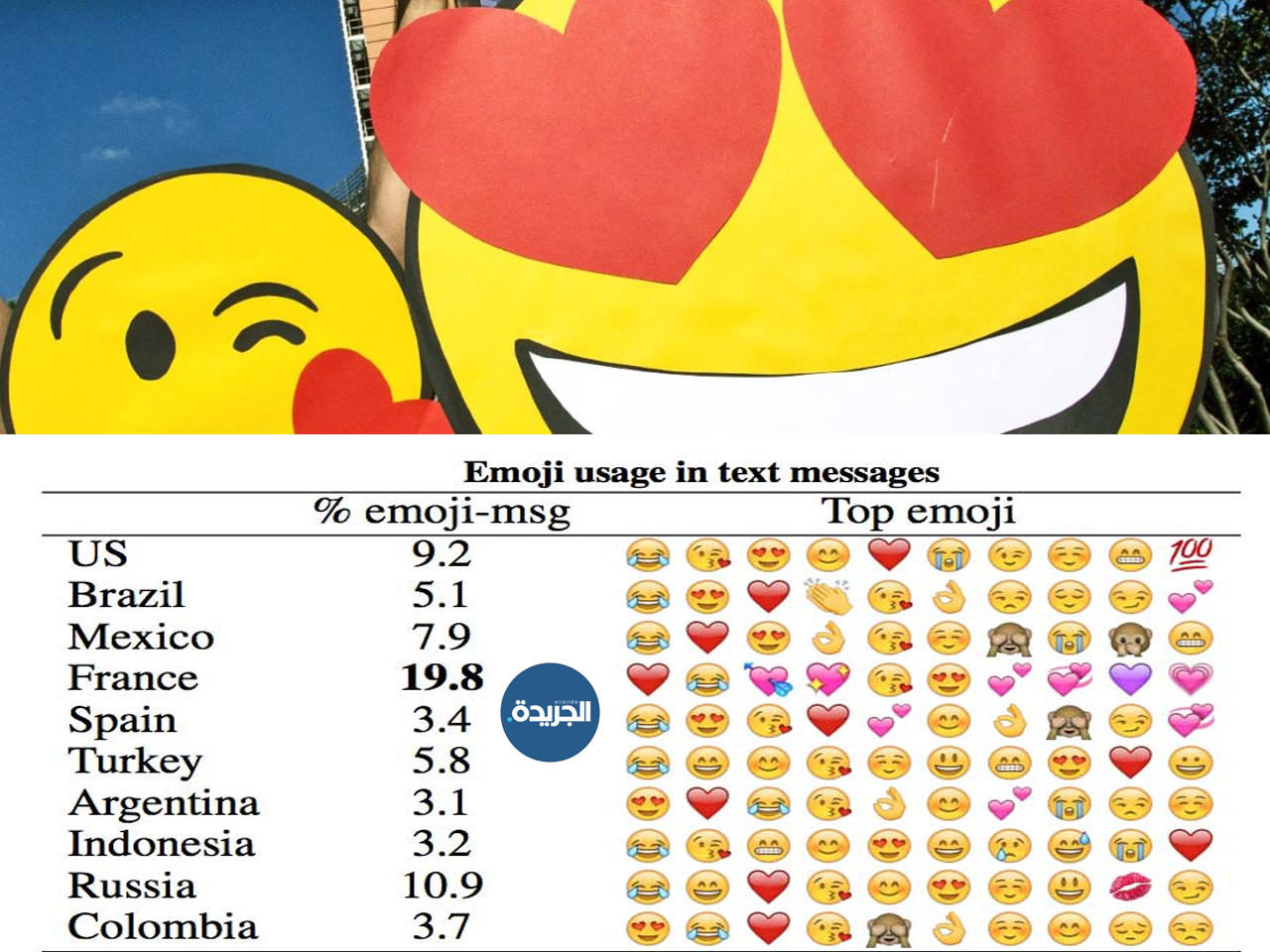 كل الناس حول العالم يحبون إيموجي الوجه الضاحك إلا الفرنسيون يحبون القلب وفق دراسة لاستخدام الإيموجي حول العالم.درس الباحثون حوالي 427 مليون رسالة من 4 ملايين مستخدم للهواتف الذكية في 212 دولة ومنطقة، للوقوف على طريقة استخدام الإيموجي إن كانت عالمية أم تختلف حسب الموقع والثقافة، وفقاً لموقع Futurity.