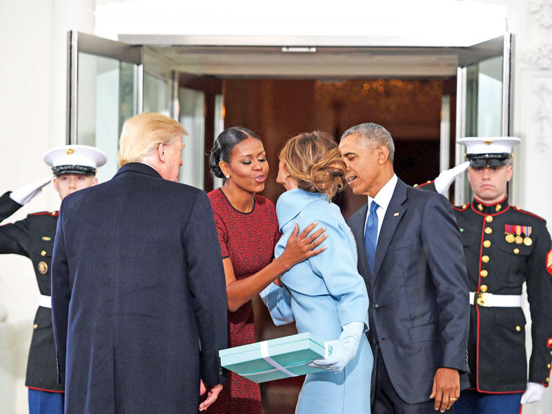 وغادر أوباما أمس المكتب البيضاوي للمرة الاخيرة قبل أن يتجه لاستقبال ترامب وزوجته ميلانيا في البيت الأبيض.ودخل أوباما البيت الابيض حيث يعمل الرؤساء الاميركيون حاملا رسالة للرئيس الذي سيخلفه ووضعها على المكتب الذي يستخدمه الرؤساء المتعاقبون ويعود للقرن التاسع عشر. ثم سيتناول باراك وميشيل أوباما الشاي مع الزوجين ترامب في القاعة الزرقاء قبل أن يغادروا معا الى الكابيتول لحفل التنصيب.3 رؤساء