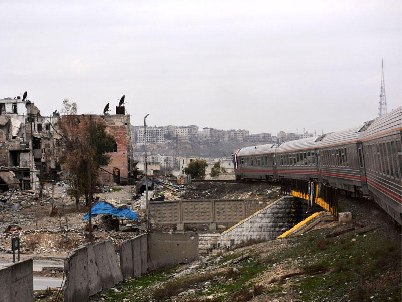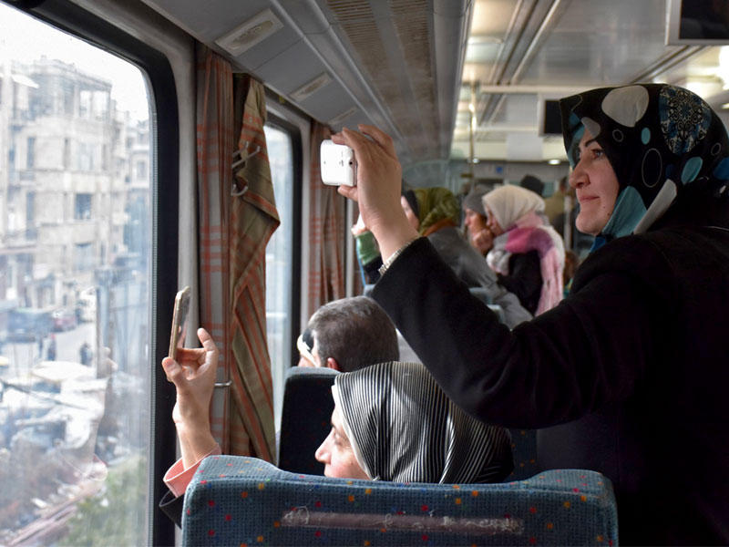 استقل مئات السوريين أمس الأول القطار بين شرق حلب وغربها للمرة الأولى منذ أكثر من أربعة أعوام. وانطلق القطار من محطة جبرين (شرق) إلى محطة بغداد (غرب)، وشاهد ركابه الشطر الشرقي من المدينة الذي دُمرت معظم مبانيه، والتقطوا صوراً بهواتفهم المحمولة، في حين تجمع سكان وسط أنقاض المباني لمشاهدته يصل الى هذه المنطقة منذ 2012.
