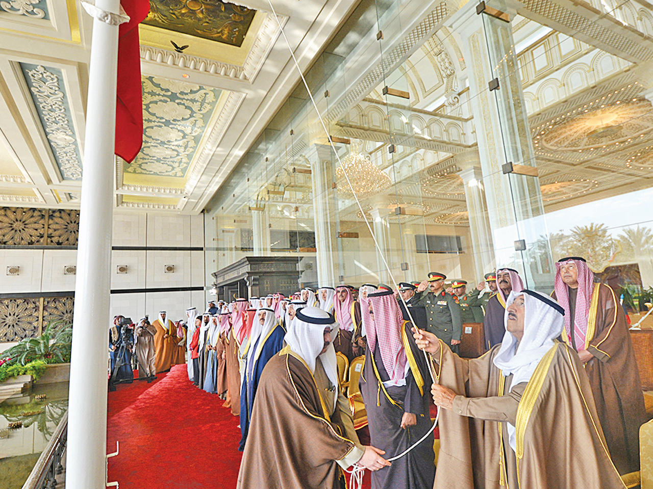 يتفضل صاحب السمو أمير البلاد الشيخ صباح الاحمد، فيشمل برعايته وحضوره مراسم رفع العلم بقصر بيان في تمام العاشرة والنصف من صباح اليوم بحضور سمو ولي العهد الشيخ نواف الاحمد وكبار المسؤولين بالدولة.من حانب آخر، ووسط حضور رسمي وشعبي، تحتفي محافظة الأحمدي برفع علم البلاد صباح اليوم، إيذانا ببدء فعاليات احتفالاتها بأعياد الكويت الوطنية والذكرى الحادية عشرة لتولي سمو أمير البلاد الشيخ صباح الأحمد مقاليد الحكم، وذلك تزامنا مع بدء مراسم الاحتفالات الرسمية في قصر بيان.وبهذه المناسبة، أكد المحافظ الشيخ فواز الخالد أن الأعياد الوطنية لدولة الكويت مبعث فخر وإعزاز لجميع المواطنين والمقيمين على ثرى بلادنا الحبيبة عاما بعد عام، وكانت وستظل مصدر استحضار لمسيرة عطاء الآباء والأجداد، سائلا المولى عز وجل أن يديم عليها نعمتي الأمن والأمان. ورفع المحافظ باسمه ونيابة عن أهالي وقاطني المحافظة الى مقام سمو أمير البلاد أسمى آيات التهنئة والتبريكات والولاء لسموه بمناسبة الذكرى الحادية عشرة لتولي سموه مقاليد الحكم في البلاد،