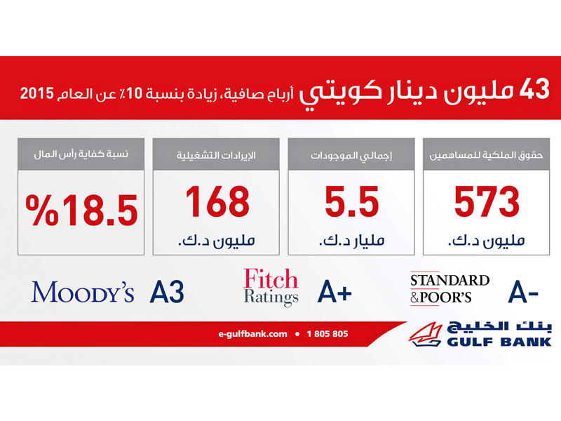 وأضاغ الغانم أن البنك يتمتع بمعدل قوي لكفاية رأس المال يبلغ 18.5 في المئة، وهو أعلى بكثير من المعدل الرقابي المطلوب والبالغ 14 في المئة، وتم تعزيز رأس مال البنك بالإصدار الناجح للشريحة الثانية من رأس المال بمقدار 100 مليون د.ك في مايو 2016. وظلت أصول البنك ثابتة، حيث بلغت 5.467 ملايين د.ك، بينما ارتفع إجمالي حقوق المساهمين بواقع 7 في المئة، ليبلغ 573 مليون د.ك، أما قروض العملاء فقد أنهت العام بمقدار 3.446 ملايين د.ك وفيما يتعلق بالربحية، فقد بلغت ربحية السهم 15 فلساً في نهاية 2016، مقارنةً بمقدار 13 فلساً في نهاية 2015. وبلغت نسبة العائد على متوسط الأصول 0.79 في المئة، مقارنةً بنسبة 0.72 في المئة في 2015، والعائد على متوسط حقوق المساهمين 7.73 في المئة، مقارنةً بنسبة 7.43 في المئة للسنة السابقة.