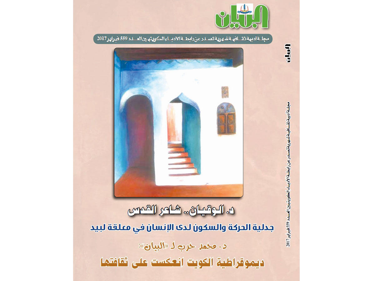 صدر عن رابطة الأدباء الكويتيين العدد الجديد من مجلة البيان لشهر فبراير، متضمناً العديد من الدراسات والقراءات النقدية. واستهلت المجلة عددها بافتتاحية عن "أدباء الكويت والقضايا العربية"، فتحدثت عن مواقف الأدباء من القضايا العربية المختلفة، كثوراتهم من أجل التحرر من الاستعمار.